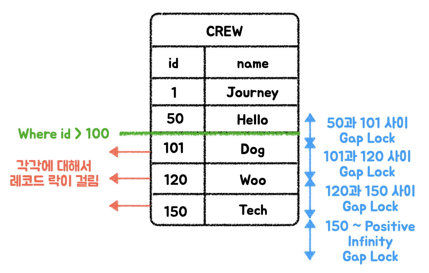 ์ด๋, id > 100์ ๋ง์กฑํ๋ id = 101์ธ ๋ฆฌ์ฝ๋๋ฅผ ๋ฐ๊ฒฌํ๋ฉด, ํด๋น ๋ ์ฝ๋ ์ง์ ์ ๋ ์ฝ๋์ ๊ทธ ์ฌ์ด ๋ฝ์ด ๊ฑธ๋ฆฐ๋ค. (50 ~ 101 ์ฌ์ด ๊ฐญ ๋ฝ)