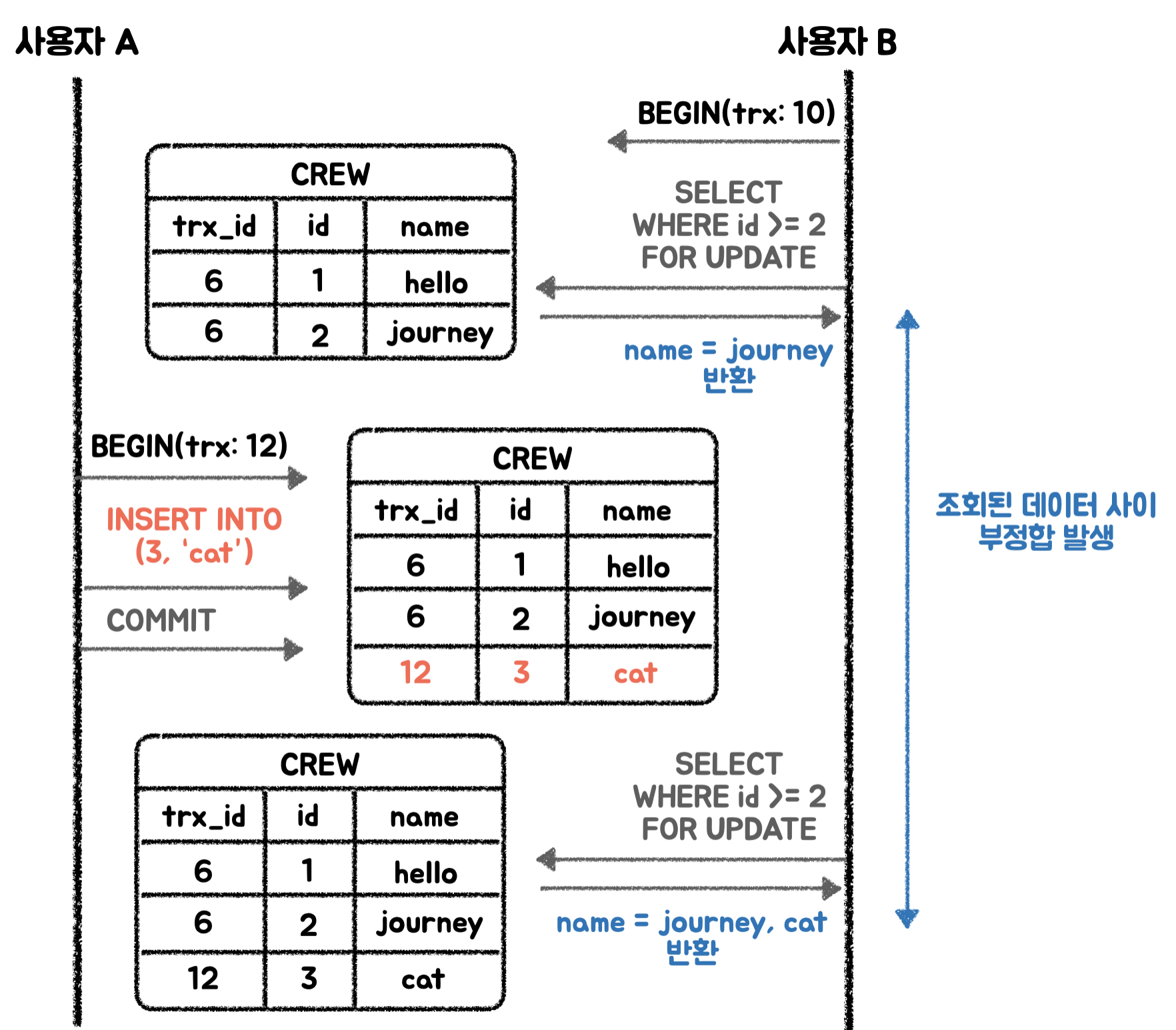 ์ฌ๊ธฐ์ '๊ฒฐ๊ณผ์ ์งํฉ์ด ๋ค๋ฅด๊ฒ ๋์๋ค'๋ ์ ์ ํฌ์ปค์ค๋ฅผ ๋ง์ถฐ์ผ ํ๋ค. non-repeatable read์ ๊ฒฝ์ฐ 1๊ฐ์ ๊ฒฐ๊ณผ๊ฐ ๋์ค์ง๋ง, ์ ๋ฐ์ดํธ๋ก ์ธํด์ hello, hi๋ผ๋ 2๊ฐ์ ๊ฒฐ๊ณผ๊ฐ ๋์๊ณ , ์ฌ๊ธฐ์์๋ journey์ journey, cat์ด๋ผ๋ 2๊ฐ์ ๊ฒฐ๊ณผ๊ฐ ๋์๋ค.