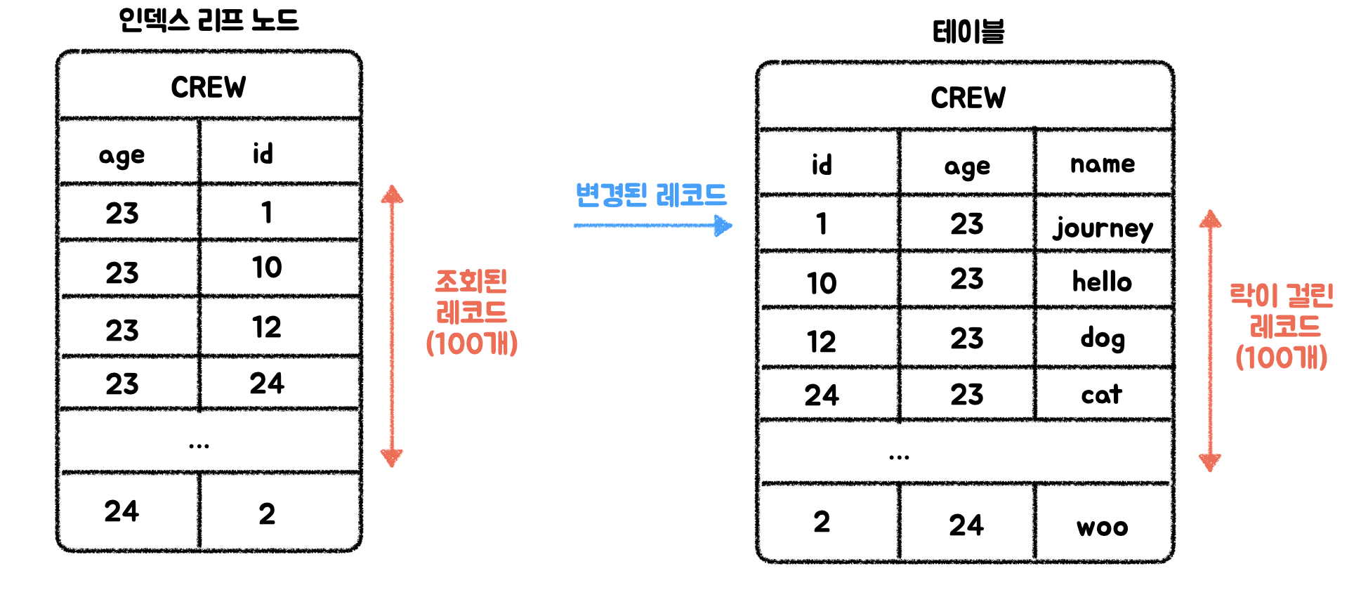 innoDB์ ๊ฒฝ์ฐ ๋ ์ฝ๋ ์์ฒด๋ฅผ ์ ๊ทธ๋ ๊ฒ๋ณด๋ค๋, ์ธ๋ฑ์ค์ ๋ ์ฝ๋๋ฅผ ์ ๊ทผ๋ค.
