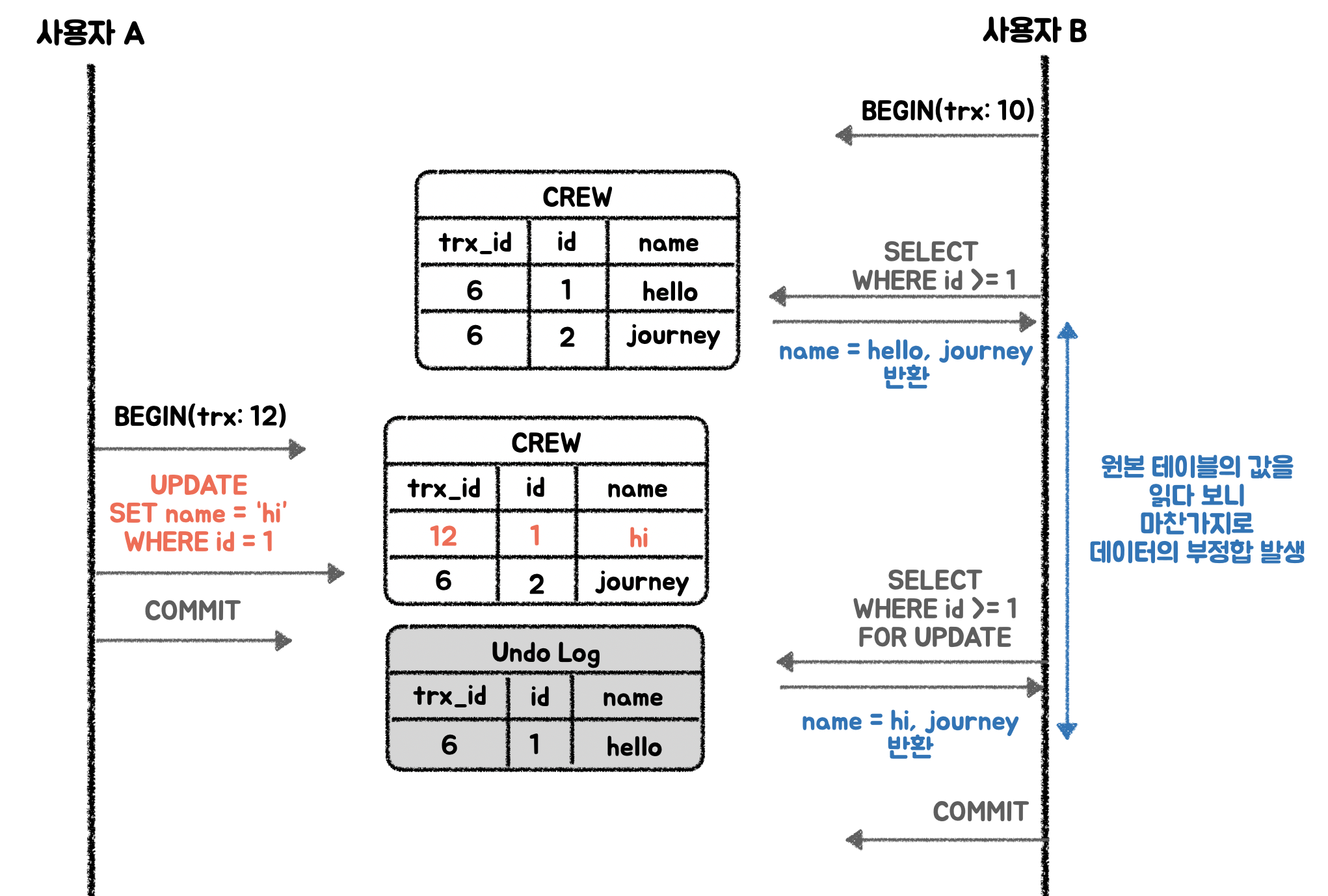 ์ด๋ธ์ ๊ฐ์ ๋ฐ์์ค๊ธฐ ๋๋ฌธ์ ๋ฐ์ดํฐ์ ๋ถ์ ํฉ์ด ๋ฐ์ํ๋ค. ์ฆ, innoDB์์ phantom read๊ฐ ๋ฌด์กฐ๊ฑด ๋ฐ์ํ์ง ์๋ ๊ฒ์ ์๋๋ค! select for update์ ๊ฒฝ์ฐ ๋ฐ์ํ ์ ์๋ค.