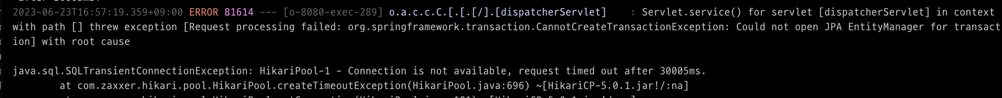 2023-06-23T16:57:19.359+09:00 ERROR 81614 --- [o-8080-exec-289] o.a.c.c.C.[.[.[/].[dispatcherServlet] : Servlet.service() for servlet [dispatcherServlet] in context with path [] threw exception [Request processing failed: org.springframework.transaction.CannotCreateTransactionException: Could not open JPA EntityManager for transaction] with root cause java.sql.SQLTransientConnectionException: HikariPool-1 - Connection is not available, request timed out after 30005ms. at com.zaxxer.hikari.pool.HikariPool.createTimeoutException(HikariPool.java:696) ~[HikariCP-5.0.1.jar!/:na] at com.zaxxer.hikari.pool.HikariPool.getConnection(HikariPool.java:181) ~[HikariCP-5.0.1.jar!/:na] at com.zaxxer.hikari.pool.HikariPool.getConnection(HikariPool.java:146) ~[HikariCP-5.0.1.jar!/:na] at com.zaxxer.hikari.HikariDataSource.getConnection(HikariDataSource.java:128) ~[HikariCP-5.0.1.jar!/:na]