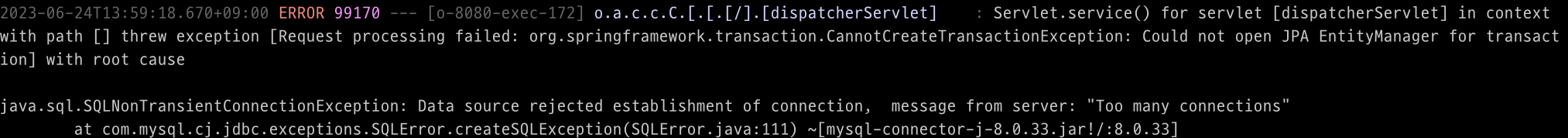 Servlet.service() for servlet [dispatcherServlet] in context with path [] threw exception [Request processing failed: org.springframework.transaction.CannotCreateTransactionException: Could not open JPA EntityManager for transaction] with root cause java.sql.SQLNonTransientConnectionException: Data source rejected establishment of connection, message from server: "Too many connections" at com.mysql.cj.jdbc.exceptions.SQLError.createSQLException(SQLError.java:111) ~[mysql-connector-j-8.0.33.jar!/:8.0.33]