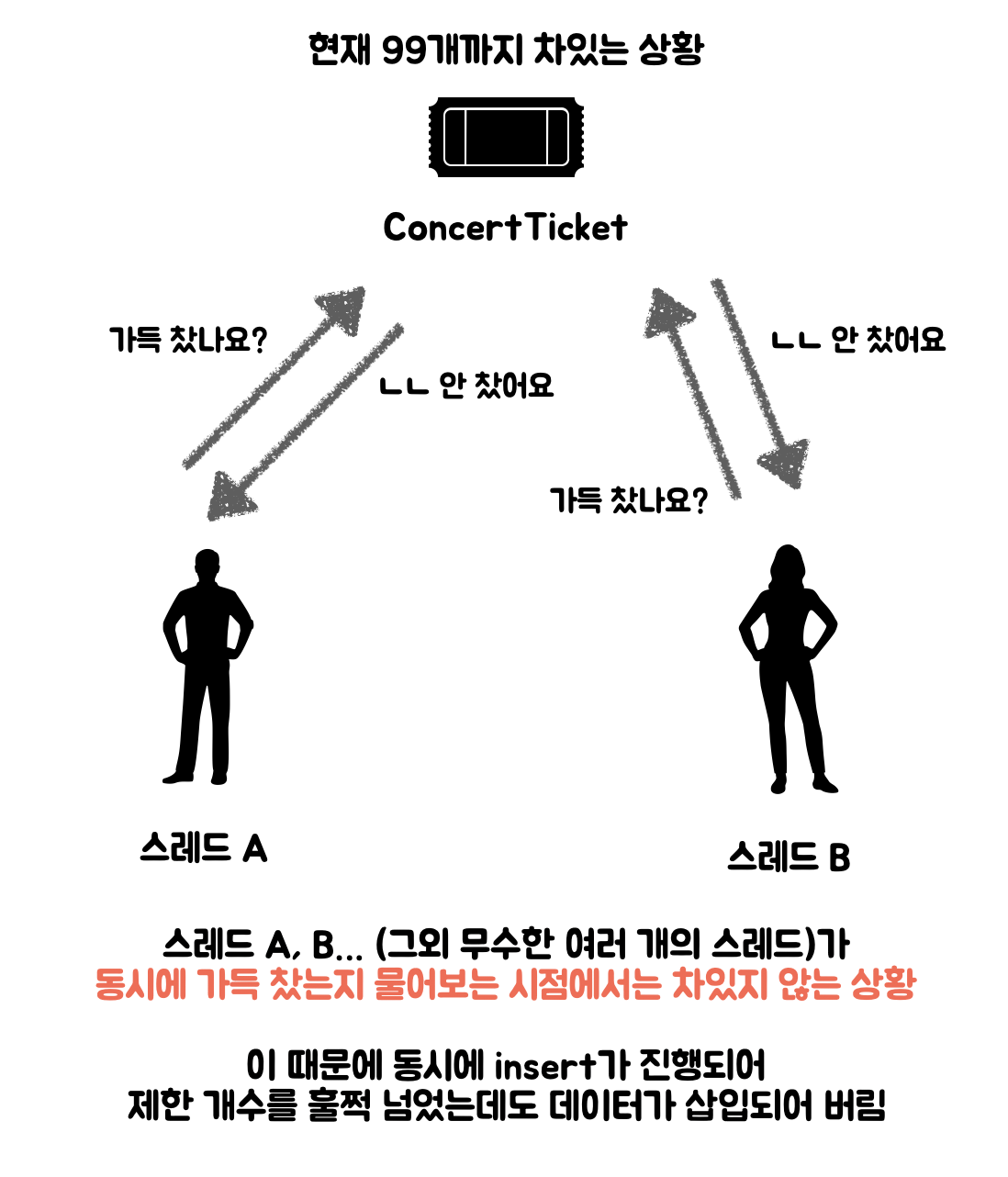 ์ฌ๋ฌ ๊ฐ์ ์ค๋ ๋๊ฐ ์กฐํํ๋ ์์ ์์๋ ๋ถ๋ช ๊ฐ๋์ฐจ์์ง ์์์ง๋ง, ๊ฒ์ฆ์ ํต๊ณผํด๋ฒ๋ฆฐ ์ค๋ ๋๊ฐ ๋์์ ์ฌ๋ฌ ๊ฐ๊ฐ ๋ฐ์ํ๋ฉด์ insert ์ฐ์ฐ ์ญ์ ํ ๋ฒ์ ์งํ๋์ด 100๊ฐ๊ฐ ๋๋ ๋ฐ์ดํฐ๊ฐ ์ฝ์ ๋ ๊ฒ์ด๋ค.