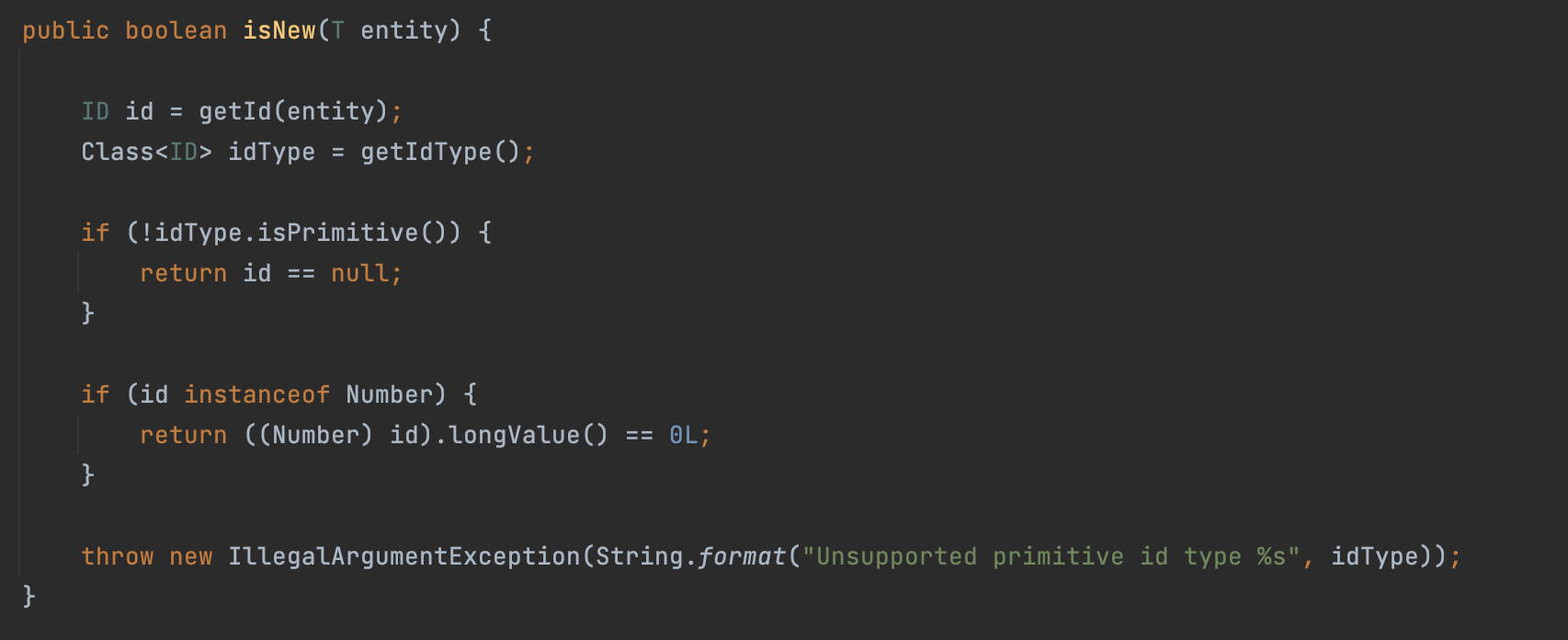 ์ฌ๊ธฐ์ isNew() ๋ฉ์๋๋ฅผ ํ๊ณ ๋ค์ด๊ฐ๋ฉด ๋ค์๊ณผ ๊ฐ๋ค.