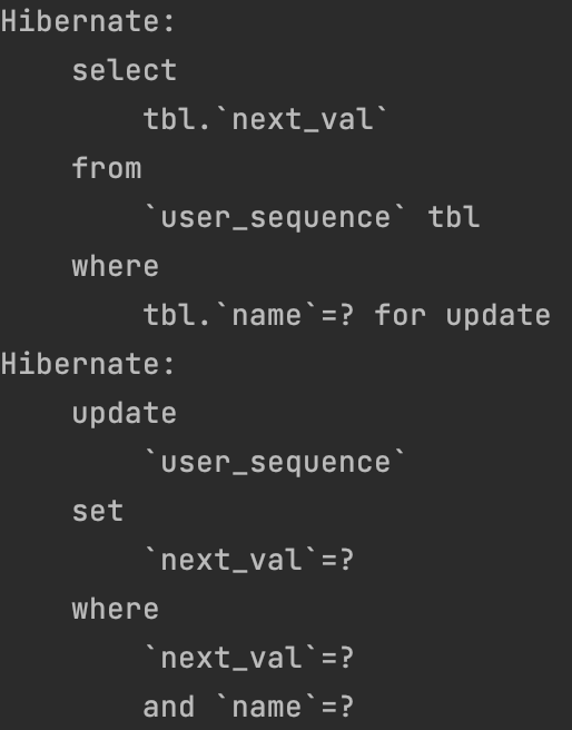 ๊ธฐ๋ณธ์ ์ผ๋ก User ๊ฐ์ฒด์ id์ ๊ธฐ๋ณธ๊ฐ์ ์ ์ํ์๊ธฐ ๋๋ฌธ์ select ์ฟผ๋ฆฌ๋ฅผ ํตํด์ ์ด๋ฏธ ๊ฐ์ฒด๊ฐ ์กด์ฌํ๋์ง ํ์ธํ ๋ค์, ์กด์ฌํ์ง ์์ผ๋ฉด user_seq์ ์ํ์ค ๊ฐ์ผ๋ก๋ถํฐ ๋ค์ ๊ฐ์ ๊ฐ์ ธ์จ๋ค.