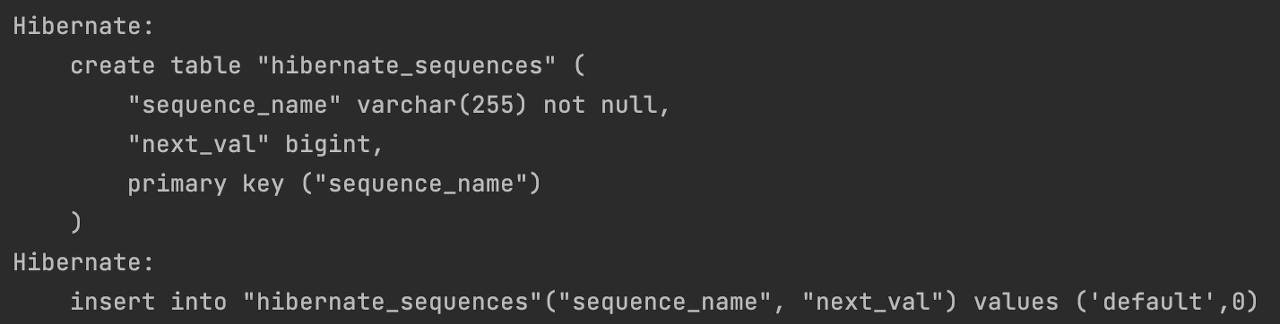 h2์ ๊ฒฝ์ฐ sequence๋ฅผ ์ง์ํ๊ธฐ ๋๋ฌธ์ ‘create sequence’๋ผ๋ ๊ฒ์ ํตํด์ sequence ๊ด๋ฆฌํ๋ค.
