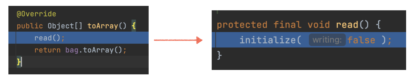 read() ๋ผ๋ ๋ฉ์๋๋ฅผ ๋ฐ๋ผ ๋ค์ด๊ฐ๋ค ๋ณด๋ฉด, ์ด๋ ํ ์ด๊ธฐํ ์์ ์ด ์ฒ์์ ๋ฐ์ํ๋ ๊ฒ์ ๋ณผ ์ ์๋ค.
