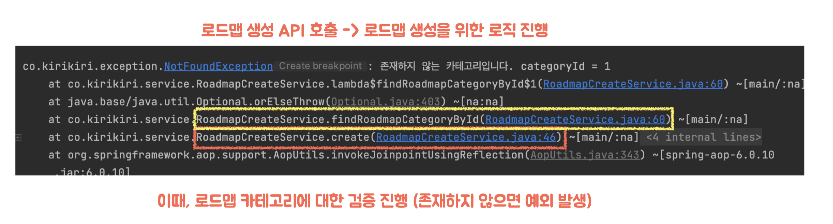 ์ด๋, ๋ก๋๋งต ์์ฑ API๊ฐ ํธ์ถ๋๋ฉด์ create ํ๋ ๊ณผ์ ์ request body ๊ฐ์ผ๋ก ๋ฐ์ ๋ก๋๋งต ์นดํ ๊ณ ๋ฆฌ ์์ด๋์ ๋ํ ์ ํจ์ฑ์ ๊ฒ์ฆํ๊ฒ ๋๊ณ , ํด๋น ๋ก์ง์์ ์นดํ ๊ณ ๋ฆฌ ์ ๋ณด๊ฐ ์กด์ฌํ์ง ์์ ๋ฐ์ํ ์ค๋ฅ์ด๋ค.