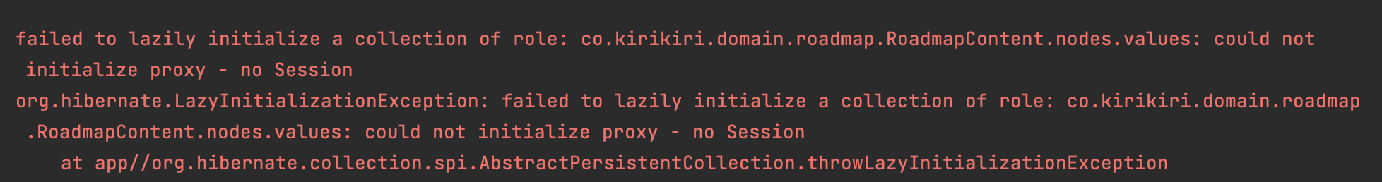 failed to lazily initialize a collection of role: co.kirikiri.domain.roadmap.RoadmapContent.nodes.values: could not initialize proxy - no Session