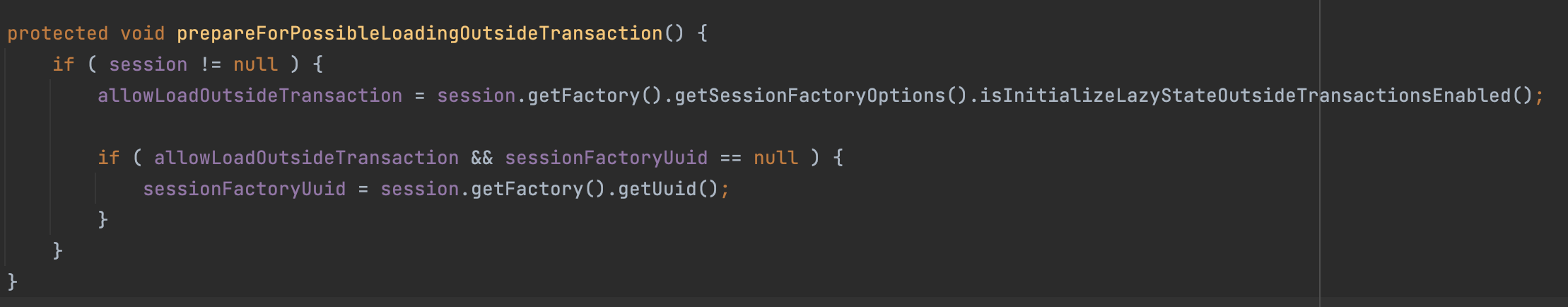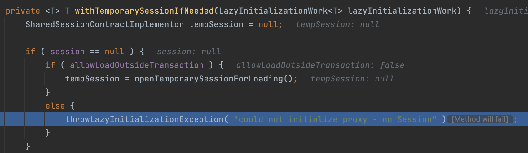 ๊ทธ๋ฆฌ๊ณ , ํด๋น ๋ฉ์๋๋ฅผ ํ๊ณ ๋ค์ด๊ฐ๋ฉด session ์ ๋ณด๊ฐ ์์ ๋ ์ธ๋ถ์ ํธ๋์ญ์ ์ ์ฌ์ฉํ ์ ์๋์ง ํ๋จํ๋๋ฐ, ์ฌ์ฉ ๋ถ๊ฐ๋ฅํ๊ธฐ ๋๋ฌธ์ (allowLoadOutsideTransaction=false) ํ๋จ์ else ๊ตฌ๋ฌธ์ผ๋ก ์ ์ด๊ฐ ๋ด๋ ค๊ฐ๊ฒ ๋์ด ์ค๋ฅ๊ฐ ๋ฐ์ํ๊ฒ ๋๋ค.