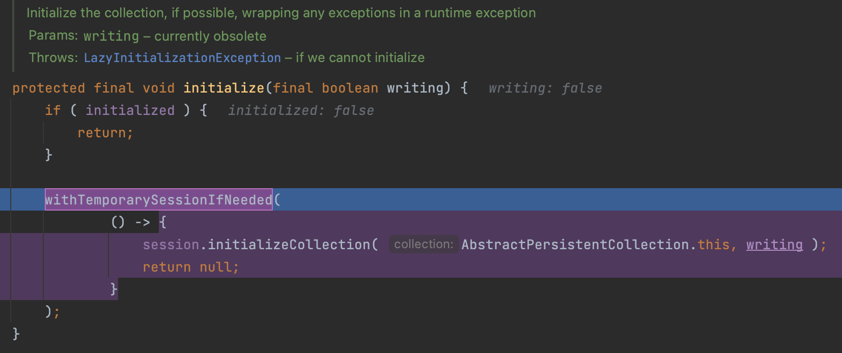 ์์์ ์ฃผ์์ ์ ์ฝ์ด๋ณด๋ฉด, ์ด๊ธฐํ๊ฐ ๋ถ๊ฐ๋ฅํ ๋ LazyInitializationException์ด ๋ฐ์ํจ์ ๋ณผ ์ ์๋ค.