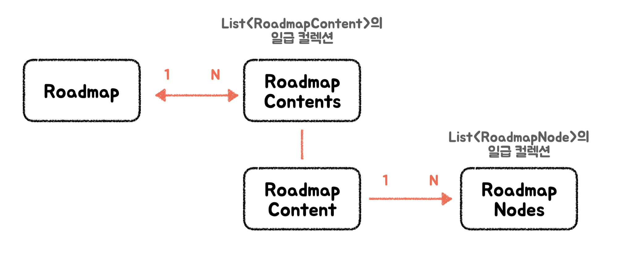 ๋ก๋๋งต (Roadmap)์ ๋ก๋๋งต ๋ด์ฉ๋ค(RoadmapContents)์ ๋ํด์ 1:N ๊ด๊ณ๋ฅผ ๋งบ๊ณ ์์ผ๋ฉฐ, ๊ฐ ๋ก๋๋งต ๋ด์ฉ(RoadmapContent)์ ๋ก๋๋งต ๋ ธ๋๋ค(RoadmapNodes)์ ๋ํด์ ๋ ๋ค์ 1:N ๊ด๊ณ๋ฅผ ๊ฐ์ง๊ณ ์๋ค.