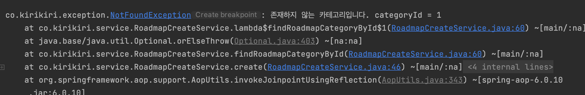 ์ค์ ๋ก ํด๋น ๋ก๊ทธ์ ์๋จ์ผ๋ก ์ฌ๋ผ๊ฐ๋ณด๋ฉด, ์์ ๊ฐ์ด ์นดํ ๊ณ ๋ฆฌ์ ๋ํ Exception์ด ๋ฐ์ํ ๊ฒ์ ๋ณผ ์ ์๋ค.