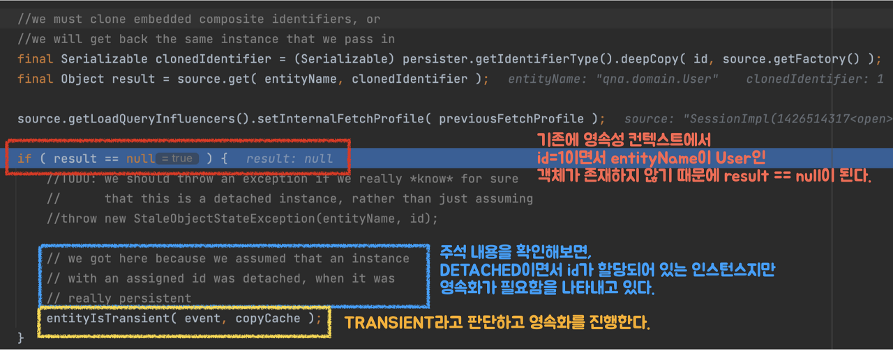 ๊ทธ๋ฆฌ๊ณ , entityIsDetached() ๋ฉ์๋๋ฅผ ๋ ํ๊ณ ๋ค์ด๊ฐ๋ฉด ์์ ๊ฐ์ ๋ถ๋ถ์ ๋ง๋ ์ ์๋ค.