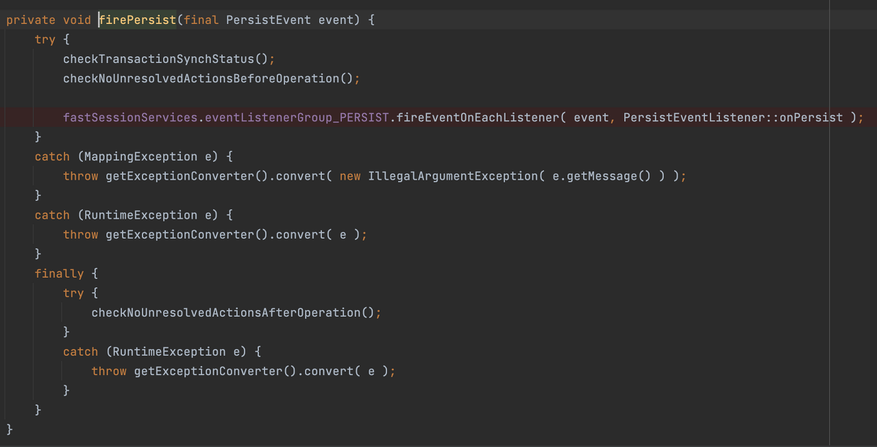 em.persist() ๋ฉ์๋๋ฅผ ํ๊ณ ๋ค์ด๊ฐ๋ค ๋ณด๋ฉด ์๋์ ๊ฐ์ด persist์ ๋ํ ์ด๋ฒคํธ๊ฐ ๋ฐ์ํ๋ ๊ฒ์ ํ์ธํ ์ ์๋ค.