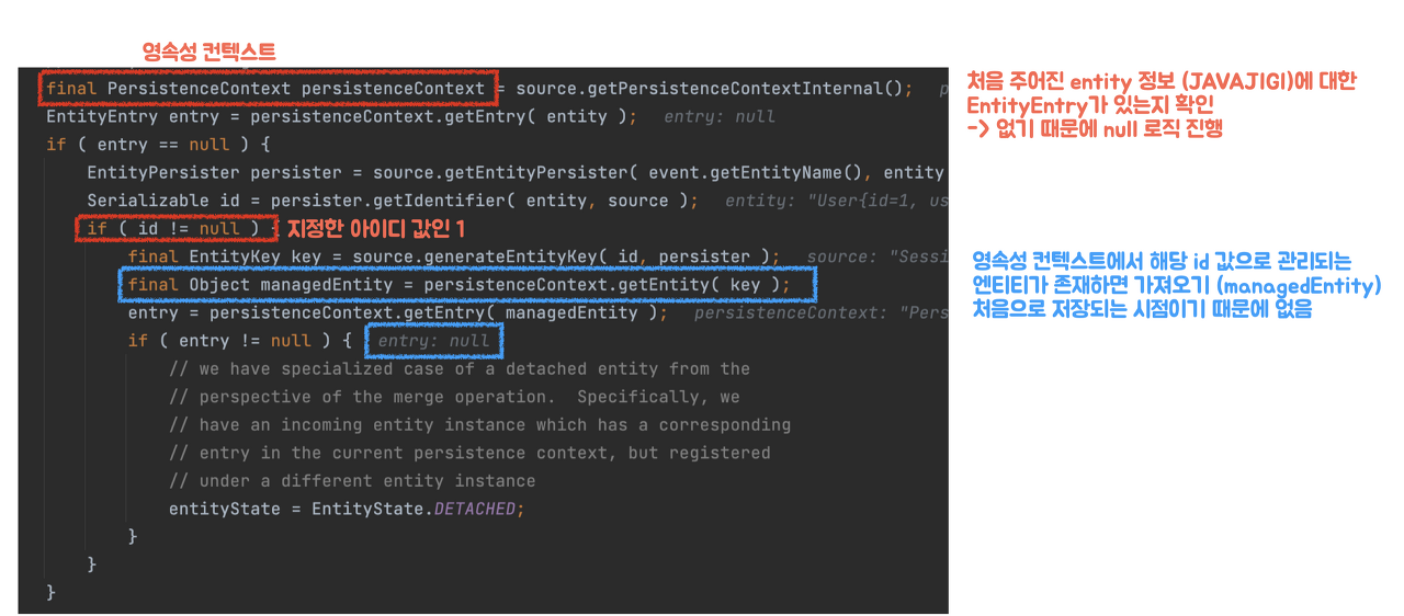 ๋ง์ฝ ์๋ก์ด ๊ฐ์ฒด๋ผ๋ฉด persist ํ ๊ธฐ์กด์ ์ํฐํฐ๋ฅผ ๋ฐํํ๊ณ , ๊ทธ๋ ์ง ์์ผ๋ฉด merge ํ "์๋ก์ด ๊ฐ์ฒด๋ฅผ ๋ฐํ" ํ๋ค๋ ๊ฒ์ด๋ค.
