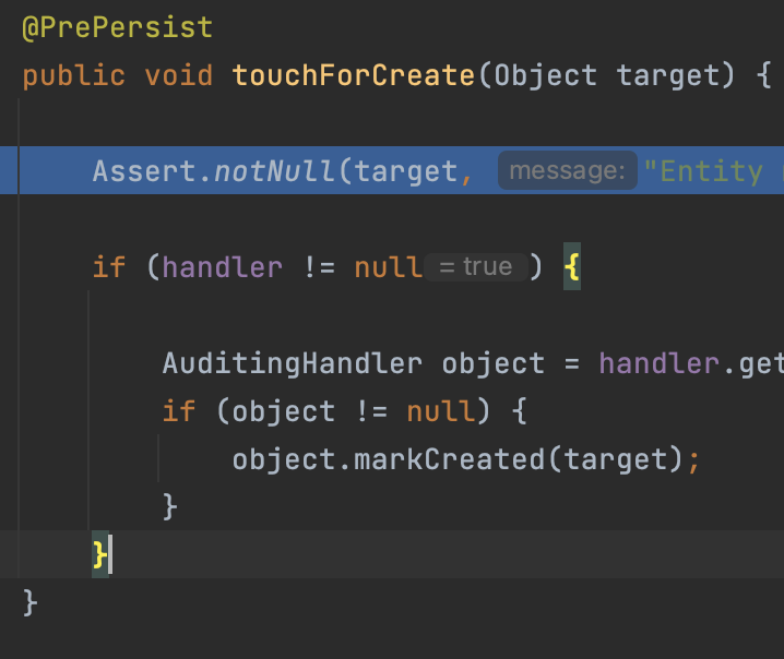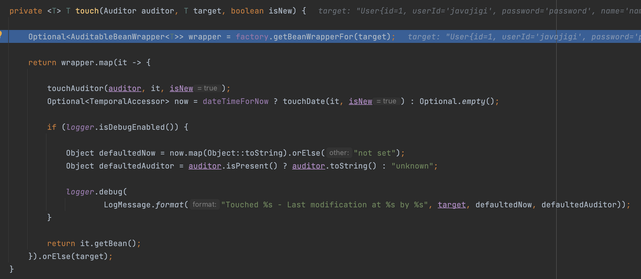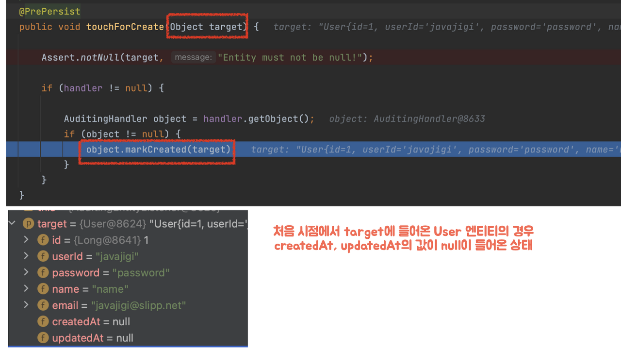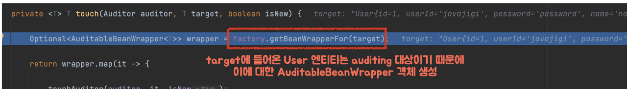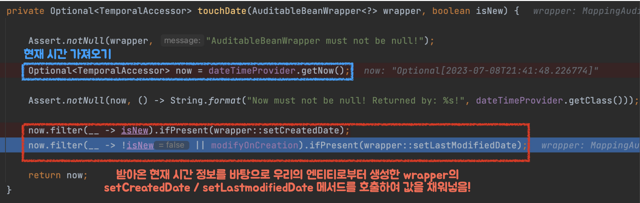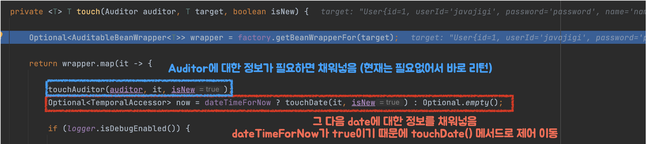 ์ฝ๋๋ฅผ ๋ณด๋ฉด touchAuditor๋ฅผ ํตํด auditor์ ๋ํ ์ ๋ณด๊ฐ ํ์ํ๋ฉด ์ฑ์๋ฃ๊ฒ ๋๋ฉฐ (@CreatedBy ๊ฐ์ ์ด๋ ธํ ์ด์ ์ ์ฌ์ฉํ ๋ ๋์ํ๋ ๋ฏํ๋ค.) ์ฐ๋ฆฌ ์ฝ๋์์๋ ํ์๊ฐ ์๊ธฐ ๋๋ฌธ์ ๋ฐ๋ก touchDate() ๋ฉ์๋๋ก ํ ๋ฒ ์ด๋ํด๋ณด์.