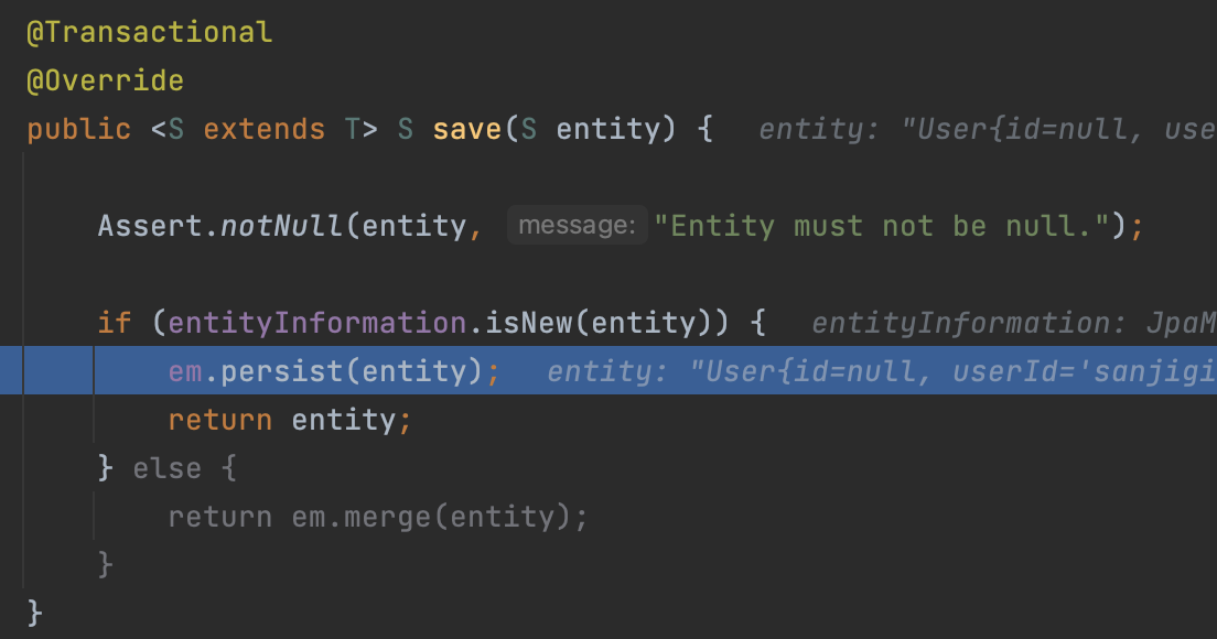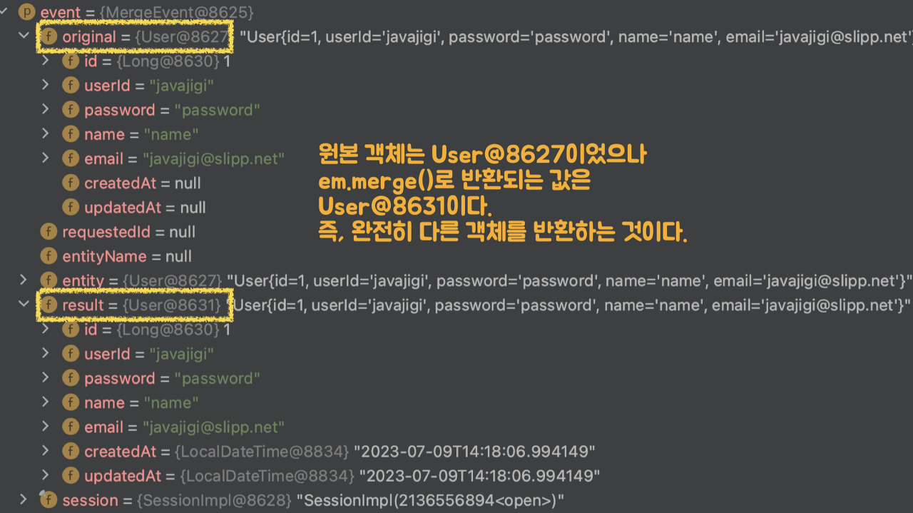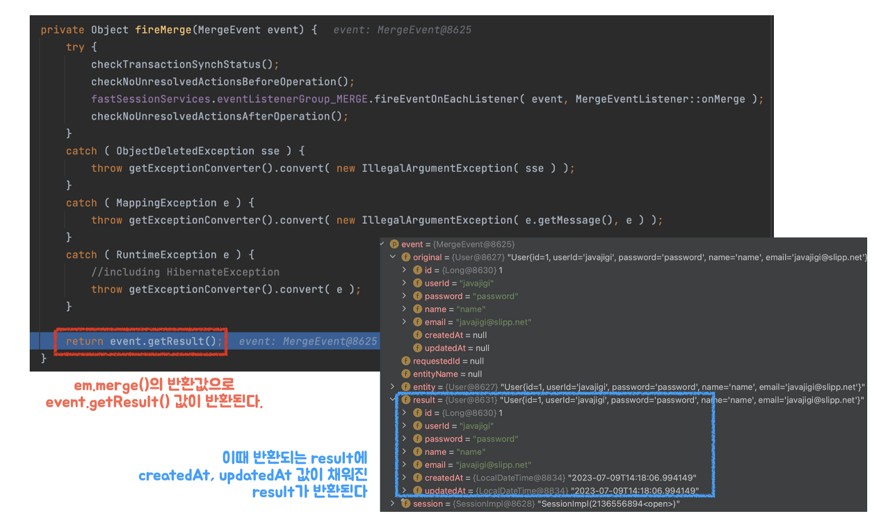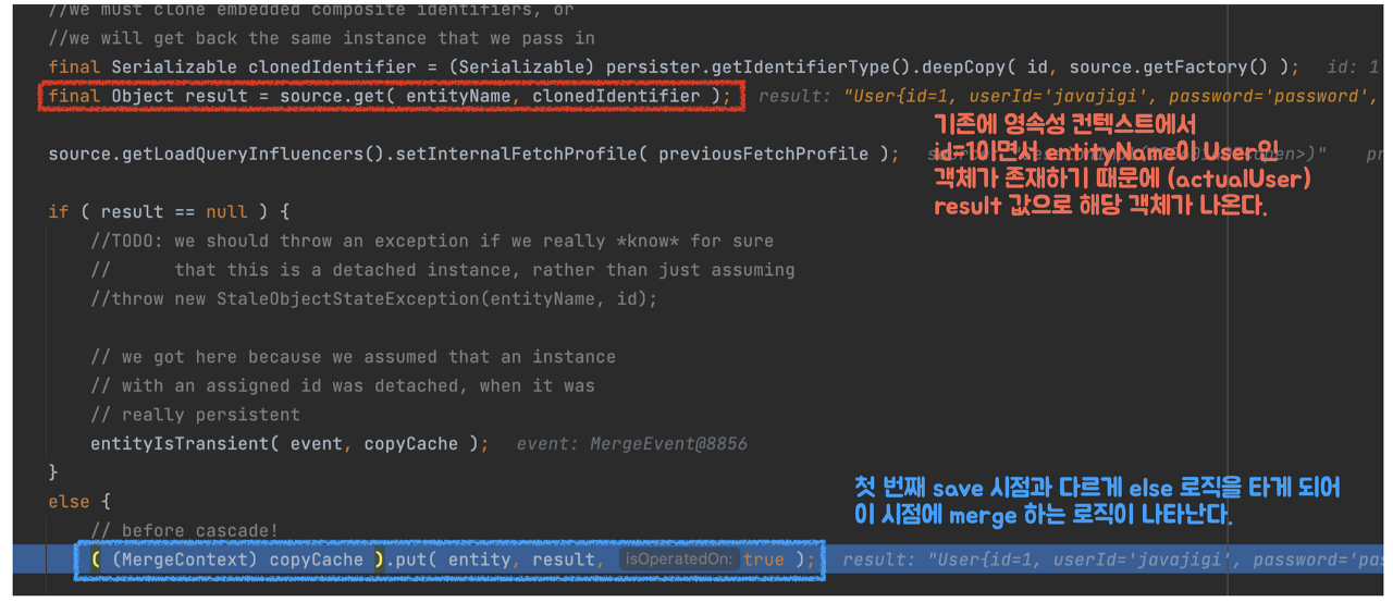 actualUser1์ด ์ ์ฅ๋๋ ์์ ์ merge() ๋ก์ง์ ๋ค์ ํ ๋ฒ ๋ณด์.