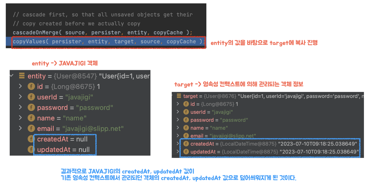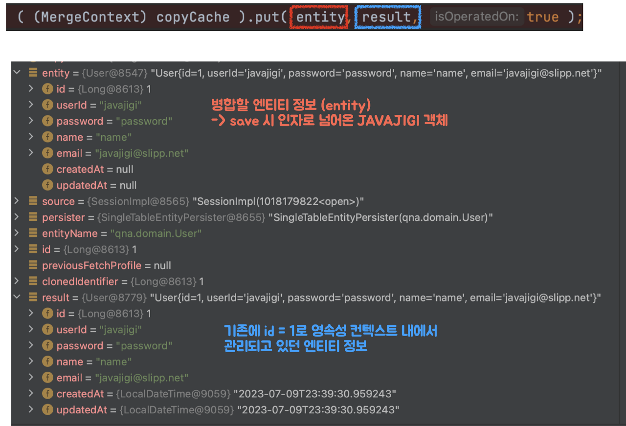 ์ค์ ํธ์ถ๋ถ๋ฅผ ๋ณด๋ฉด ๋ณํฉํ ์ํฐํฐ๋ก ๊ธฐ์กด์ JAVAJIGI ๊ฐ์ฒด๊ฐ, ์ด๋ฏธ ๊ด๋ฆฌ๋๊ณ ์๋ ์ํฐํฐ๋ก ์์์ฑ ์ปจํ ์คํธ์ ์ํด ๊ด๋ฆฌ๋๋ actualUser1 ๊ฐ์ด ๋ค์ด๊ฐ๋ ๊ฒ์ ๋ณผ ์ ์๋ค.
