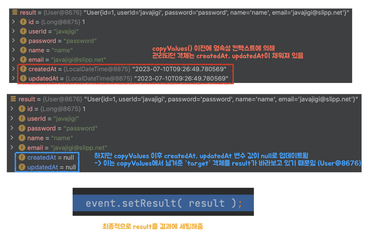 ์ด ๋ฉ์๋์์๋ event.getResult() ๋ผ๋ ๊ฐ์ด ๋ฐํ๋๋๋ฐ, result์์๋ createdAt, updatedAt ๊ฐ์ด ์ฑ์์ง ๊ฐ์ฒด๊ฐ ๋ฐํ๋๋ค.