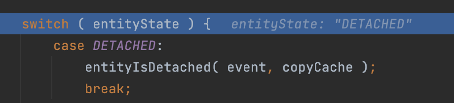 ์ฌ๊ธฐ์ MergeEventListener::onMerge ๋ฉ์๋๋ฅผ ํ๊ณ ๋ค์ด๊ฐ๋ค ๋ณด๋ฉด, entityState ๋ผ๋ ๋ณ์์ ‘DETACHED’๋ผ๋ ๊ฐ์ด ๋ค์ด๊ฐ๋ค.