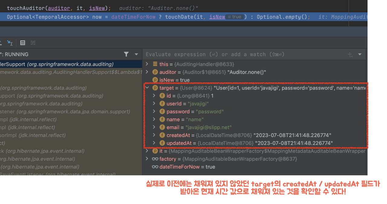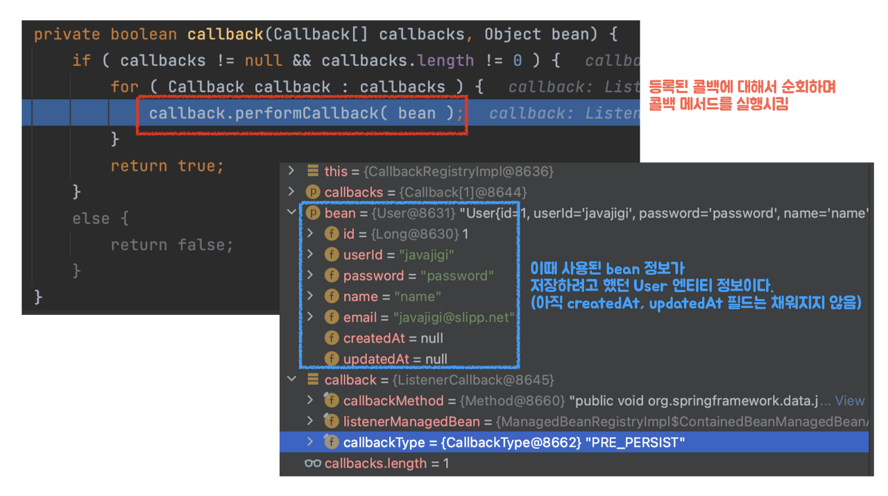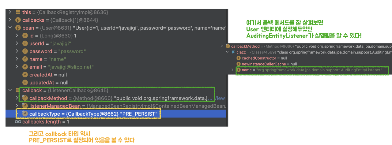 ์ฌ๊ธฐ์ callback์ ํ์ธํด๋ณด๋ฉด User ์ํฐํฐ์์ ์ค์ ํ๋ AuditingEntityListener๊ฐ ์คํ๋ ๊ฒ์ ๋ณผ ์ ์๋ค.