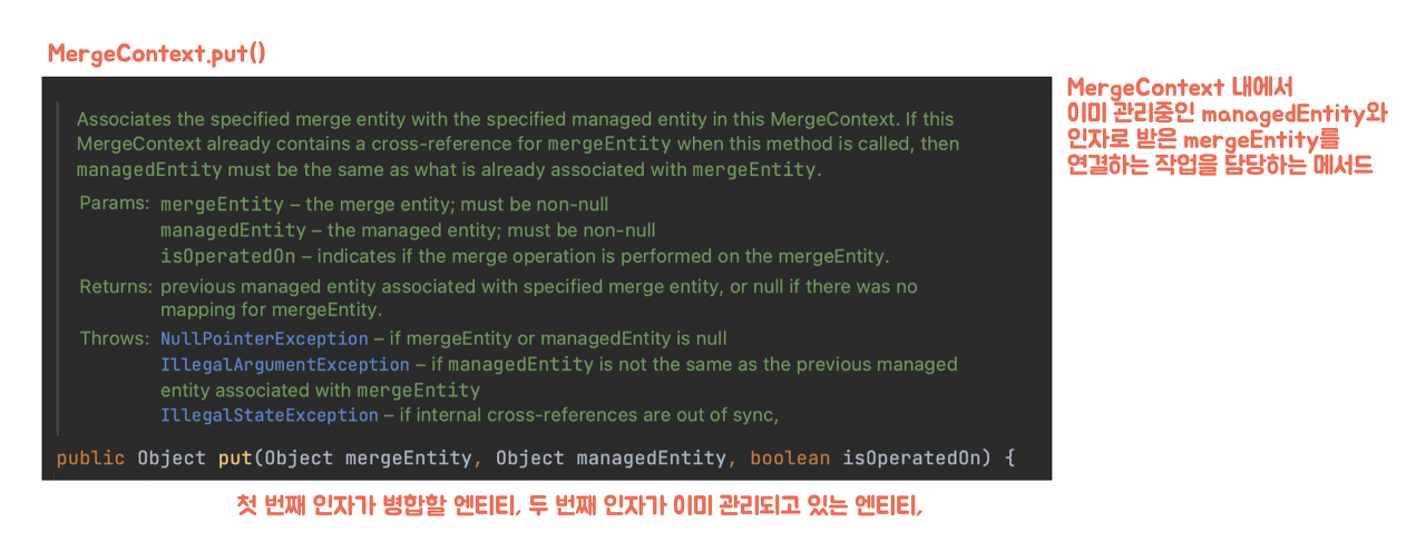 MergeContext.put()์ ๊ฒฝ์ฐ, ์ฒซ ๋ฒ์งธ ์ธ์๋ก ๋ณํฉํ ์ํฐํฐ๋ฅผ, ๋ ๋ฒ์งธ ์ธ์๋ก ์ด๋ฏธ ๊ด๋ฆฌ๋๊ณ ์๋ ์ํฐํฐ๋ฅผ ๋ฐ์์ ๋ณํฉํ๋ค.