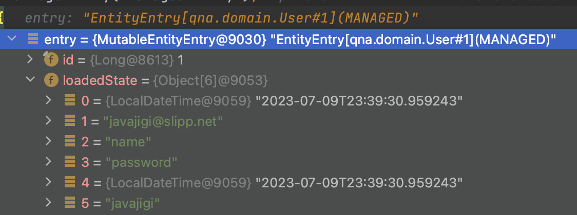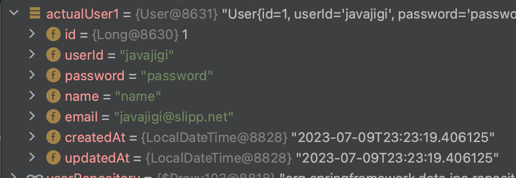 ์ค์ ๋ก entry ๊ฐ์ด ์์ ๊ฐ์ด createdAt, updatedAt์ด ์ฑ์์ง actualUser1 ๊ฐ์ฒด์์ ํ์ธํ ์ ์๋ค.