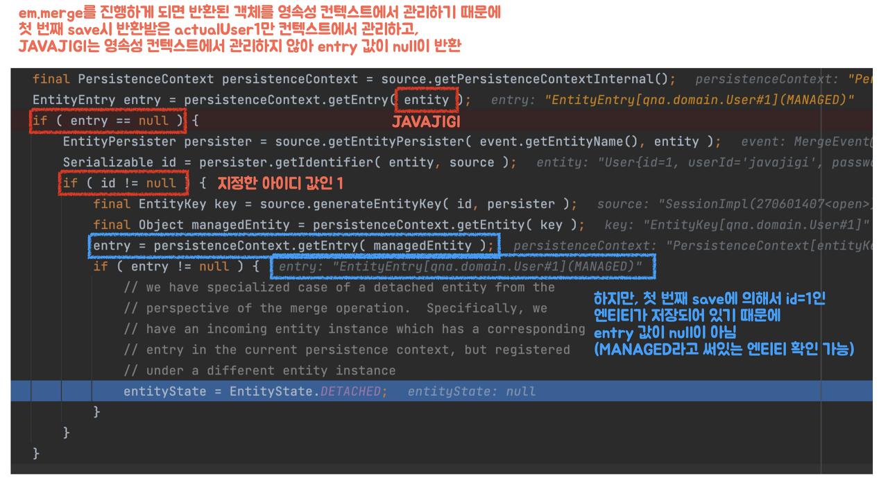 ๊ทธ๋ ๊ธฐ ๋๋ฌธ์ ์ฒซ ๋ฒ์งธ save() ์์ ๋ฐํ๋ actualUser1๋ง ์์์ฑ ์ปจํ ์คํธ์์ ๊ด๋ฆฌํ๊ณ , JAVAJIGI๋ ์์์ฑ ์ปจํ ์คํธ์์ ๊ด๋ฆฌํ์ง ์๊ฒ ๋๋ค. ํ์ง๋ง, ๋ ๋ฒ์งธ save ์ id ๊ฐ์ด ์ด๋ฏธ 1L๋ก ์ฑ์์ง ๊ฐ์ฒด๊ฐ ์ธ์๋ก ๋ค์ด์๊ณ , ์์์ฑ ์ปจํ ์คํธ์๋ id = 1L์ธ actualUser๊ฐ ๊ด๋ฆฌ๋๊ณ ์๊ธฐ ๋๋ฌธ์ entry ๊ฐ์ด null์ด ์๋๊ฒ ๋๋ค.