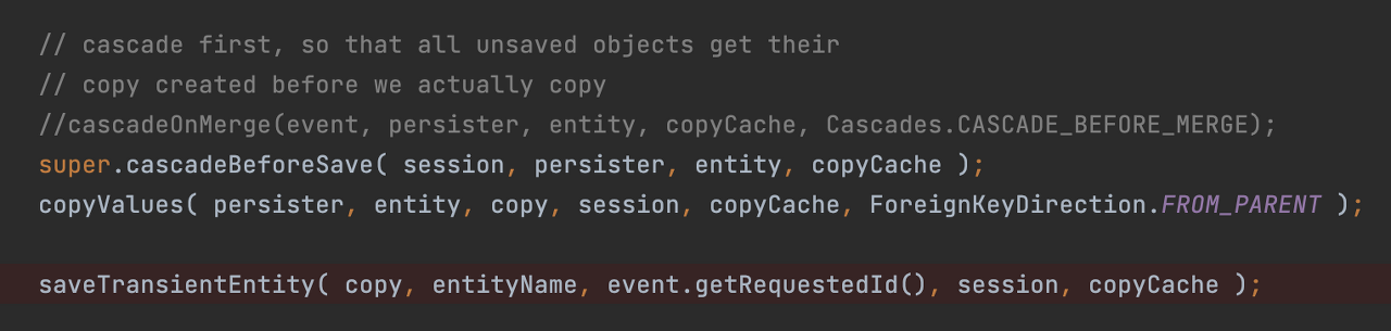 ์ฒซ ๋ฒ์งธ save() ๋ก์ง์์๋ MergeEventListener::onMerge ๋ฉ์๋์์ (merge ์ด๋ฒคํธ ๋ฐ์ํ ๋) ๋ด๋ถ๋ฅผ ๋ฐ๋ผ๊ฐ๋ค๋ณด๋ฉด ์์์ฑ ์ปจํ