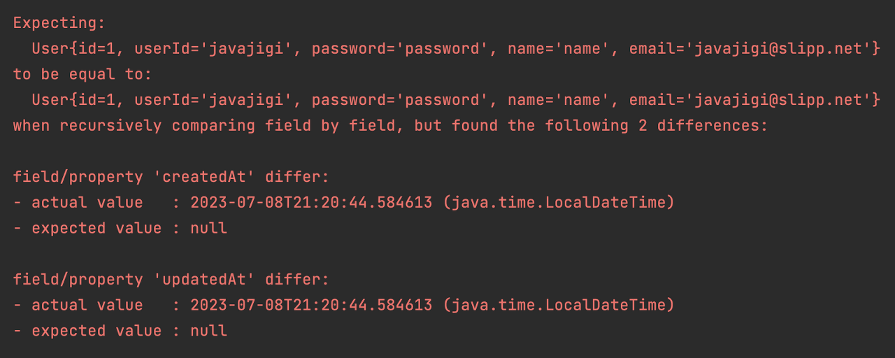 ๊ทธ๋์, actualUser2์ createdAt, updatedAt ๊ฐ์ด null์ด ๋์ด์ JAVAJIGI๋ ๊ฐ์ ๊ฐ์ ๊ฐ์ง๊ฒ ๋๋ ๊ฒ์ด๋ค.