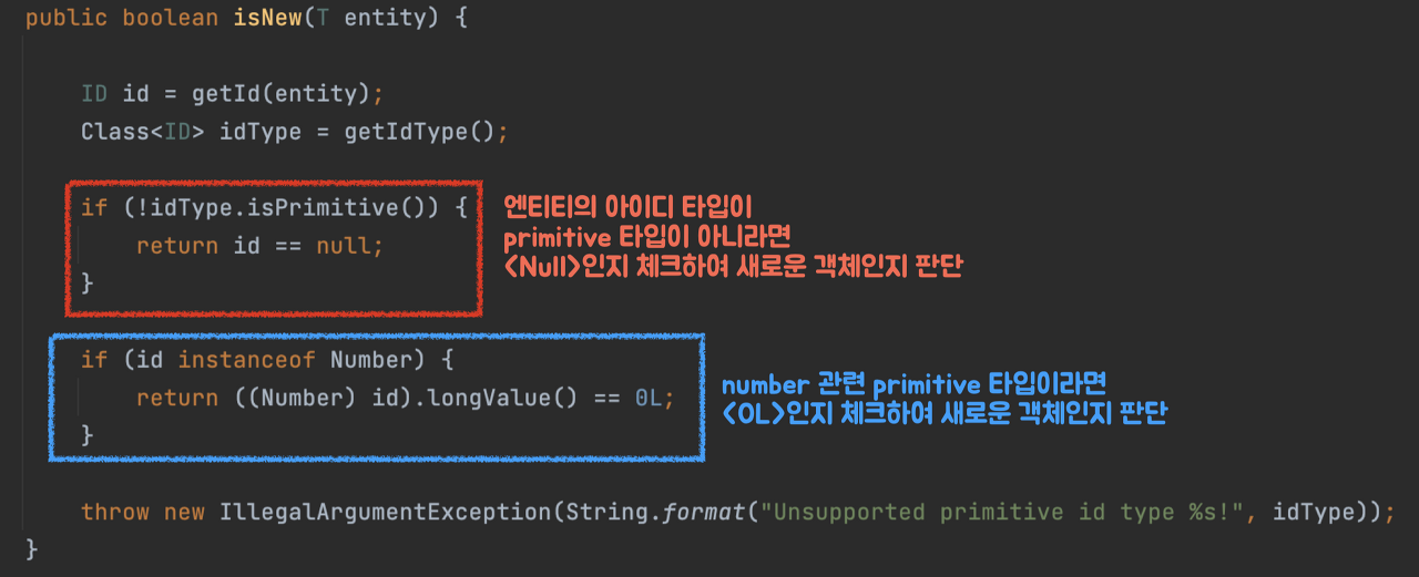 ๊ธฐ๋ณธ์ ์ผ๋ก id (@Id ์ด๋ ธํ ์ด์ ์ด ๋ถ์ด์๋ ํ๋)๊ฐ primitive ํ์ ์ด ์๋๋ผ๋ฉด null ์ฌ๋ถ๋ฅผ ํตํด ์๋ก์ด ๊ฐ์ฒด์์ ํ๋จํ๊ณ ,