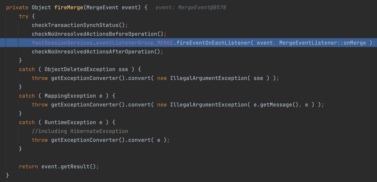 ๋ค์ ๋์๊ฐ์, em.merge()๊ฐ ์ํ๋ ๋ ํธ์ถ๋๋ fireMerge() ๋ฉ์๋๋ฅผ ๋ณด์.