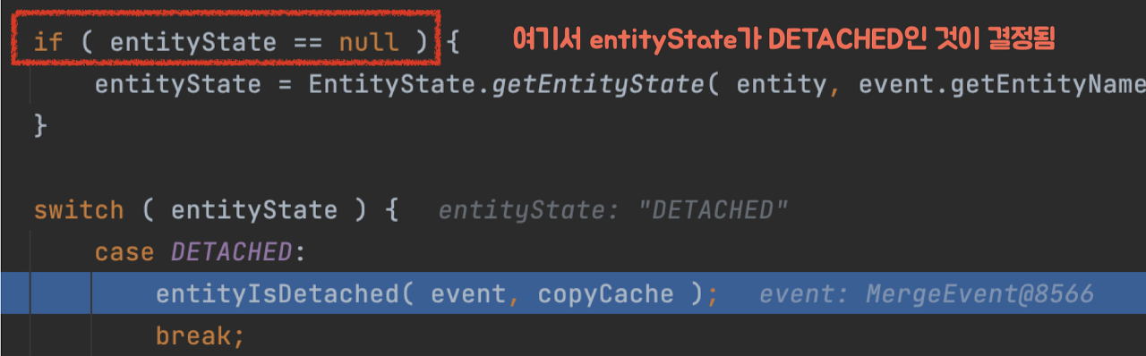 ๋ํ, entityState๊ฐ null์ด์์ง๋ง, getEntityState๋ฅผ ํตํด DETACHED์ธ ์ํ๋ผ๊ณ ํ๋จํ๊ฒ ๋๋ค.