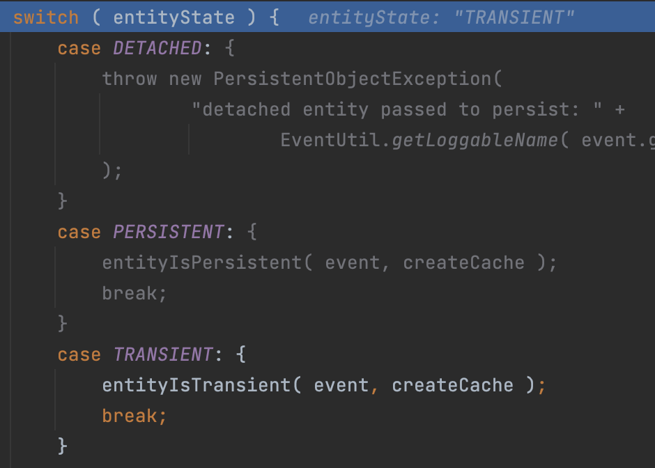PersistEventListener::onPersist๋ฅผ ํ๊ณ ๋ค์ด๊ฐ๋ค ๋ณด๋ฉด ์๋์ ๊ฐ์ด entityState๊ฐ ‘TRANSIENT’ ์ํ์ธ ๊ฒ์ ๋ณผ ์ ์๋ค.