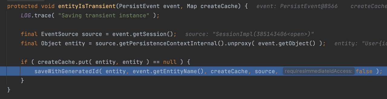 ์ ๋ฉ์๋์์ entityIsTransient() ๋ฉ์๋๋ฅผ ํ๊ณ ๋ค์ด๊ฐ๋ค ๋ณด๋ฉด, ์์ ๊ฐ์ ์ํฉ์ ๋ง๋ ์ ์๋ค.