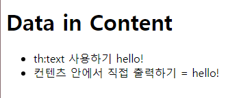 <li>th:text ์ฌ์ฉํ๊ธฐ <span th:text="${data}"></span></li>