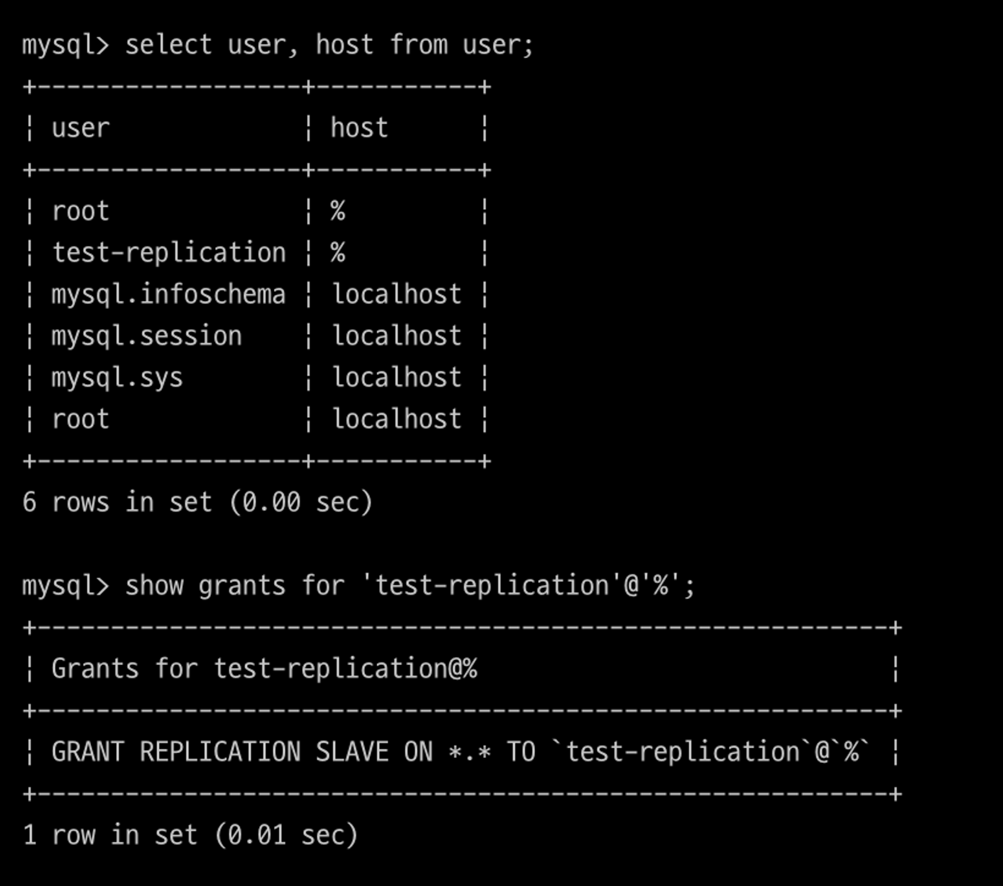 Replication ์์๋ Slave Thread๊ฐ Master Thread ์ชฝ์ผ๋ก ์ ์์ ์์ฒญํ๊ธฐ ๋๋ฌธ์, Slave๊ฐ ์ผ์ข ์ ํด๋ผ์ด์ธํธ์ด๊ณ , Master๊ฐ ์๋ฒ๋ผ๊ณ ๋ณผ ์ ์๋ค. ์ด๋ Master์๋ Slave๊ฐ ๋ก๊ทธ์ธ์ ํ๊ธฐ ์ํ ๊ณ์ ๊ณผ ๊ถํ (Replication Slave)๊ฐ ํ์ํ๋ค. ๋ง์คํฐ ์๋ฒ์ ์ ์ํ์ฌ ์๋์ ๊ฐ์ด ๊ณ์ ์ ์์ฑํ๊ณ ๊ถํ์ ๋ถ์ฌํด์ฃผ์.