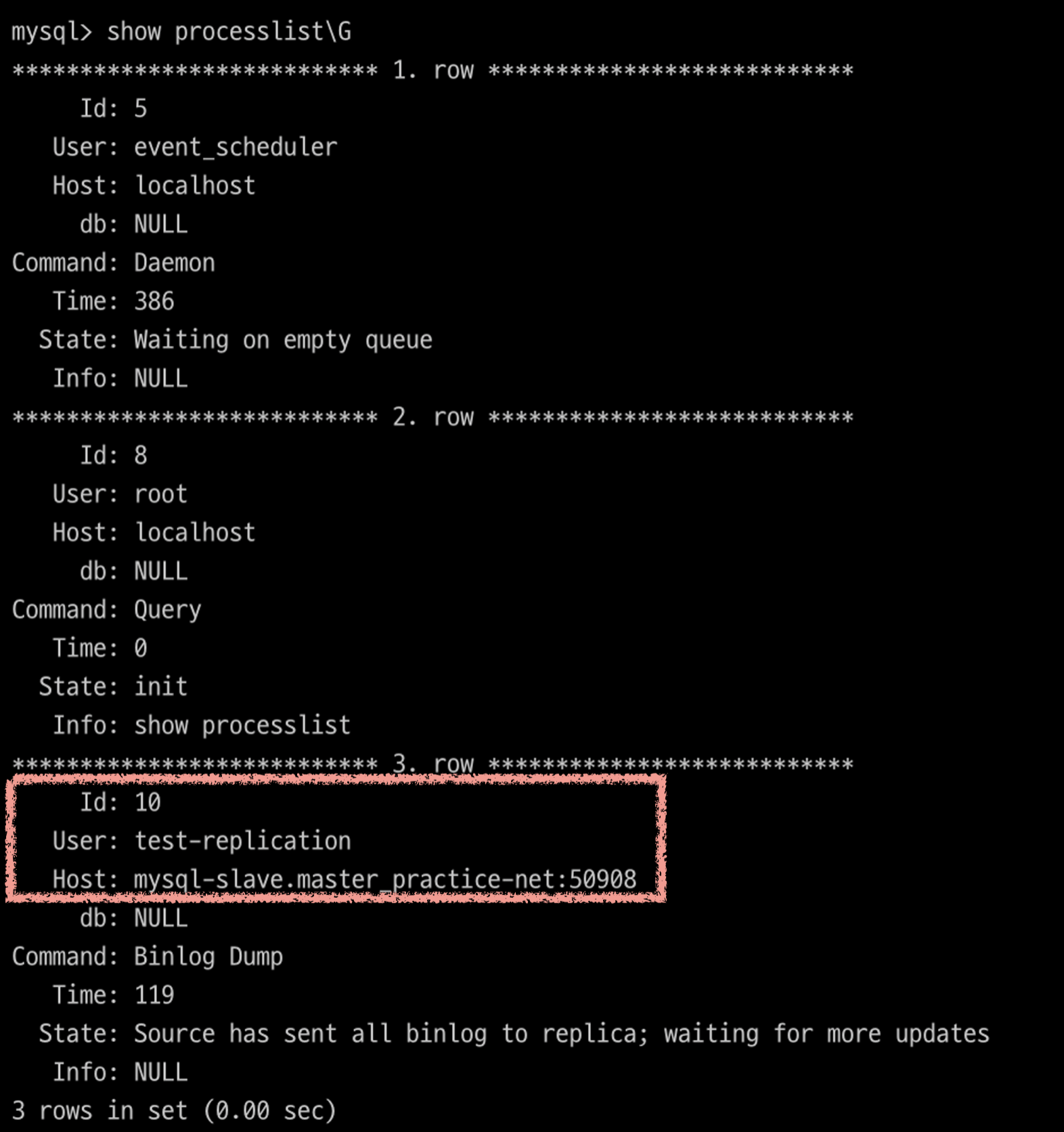 ๊ฐ์ฅ ์๋์ ์ฐ๋ฆฌ๊ฐ ์ฐ๋ํ๋ test-replication ์ด๋ผ๋ ์น๊ตฌ์ ๋ํด State๋ก ‘source๊ฐ ๋ชจ๋ binlog๋ฅผ replication์ ๋ณด๋๋ค’ ๋ผ๋ ๋ฌธ๊ตฌ๋ฅผ ํ์ธํ ์ ์๋ค!