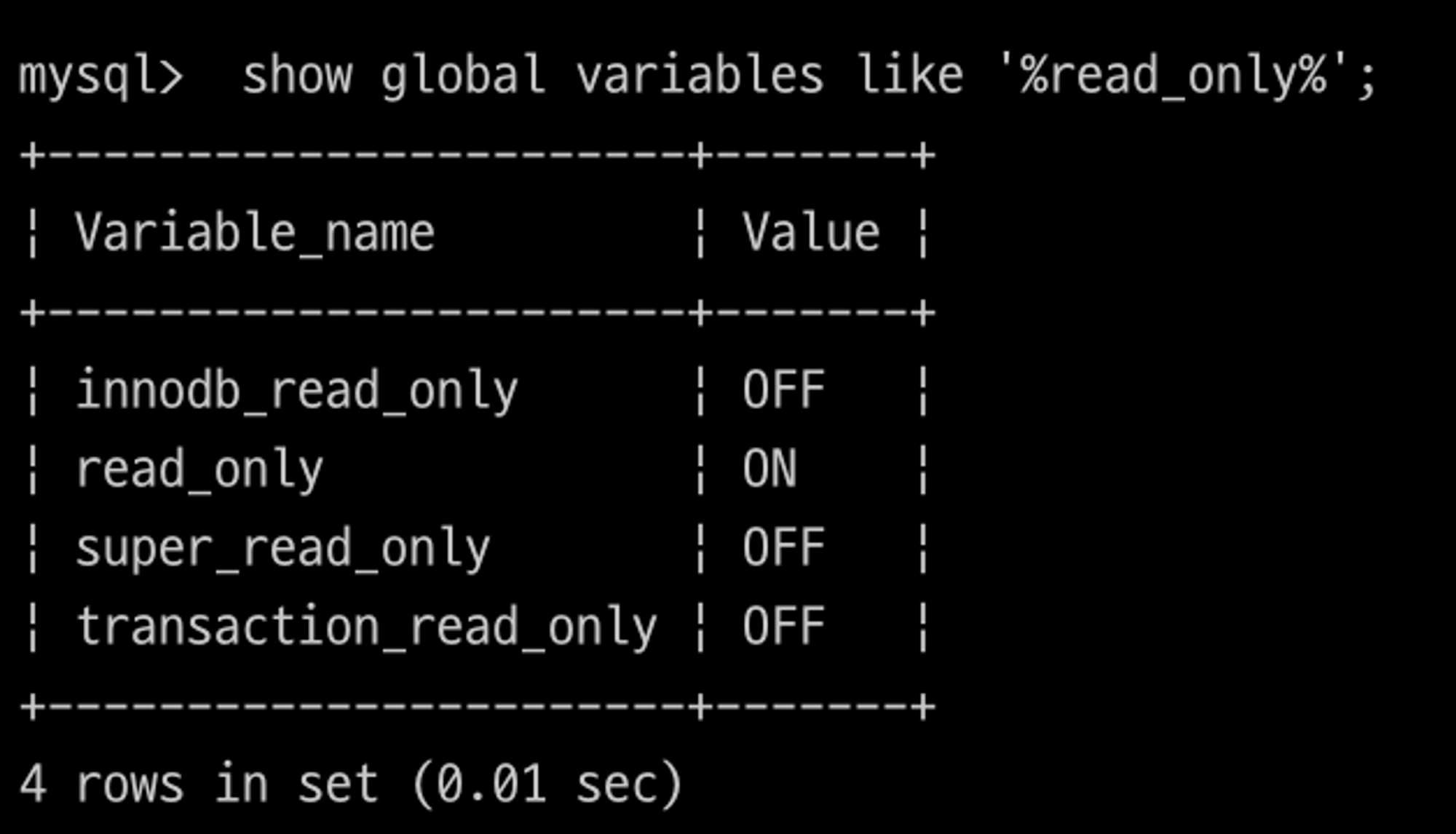 - read_only: ์ฌ๋ ์ด๋ธ ์๋ฒ๋ ์ฝ๊ธฐ ์ ์ฉ์ผ๋ก ์ค์ ํ๋ค. (๋ง์คํฐ ์๋ฒ์์๋ง ์ฐ๊ธฐ ์ฐ์ฐ์ด ๋ฐ์ํ๋๋ก ๋ง๋ค๊ธฐ ์ํด ์ค์ ํด์ค๋ค.)