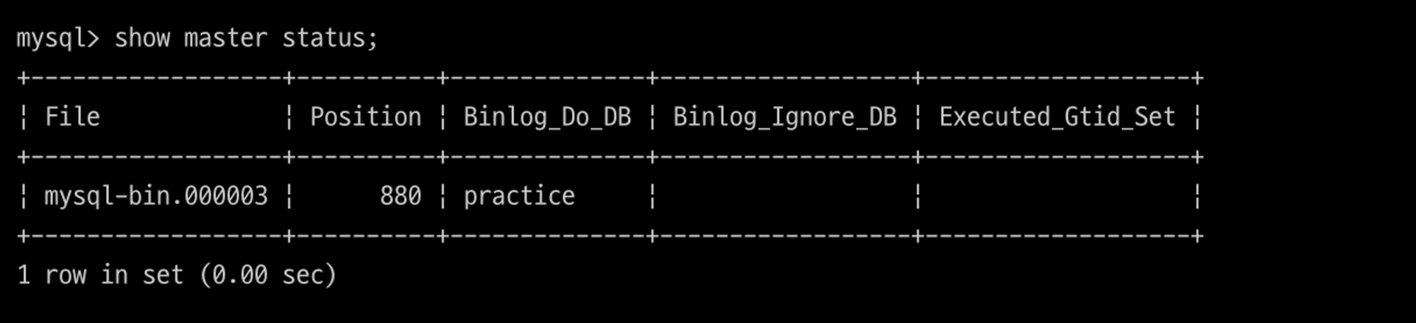 - MASTER_LOG_FILE / MASTER_LOG_POST: ์์ ๋ง์คํฐ ์๋ฒ์ ๋ฐ์ด๋๋ฆฌ ๋ก๊ทธ ํ์ผ ์ ๋ณด์์ ๋ดค๋ ํ์ผ ์ด๋ฆ๊ณผ ์คํ์