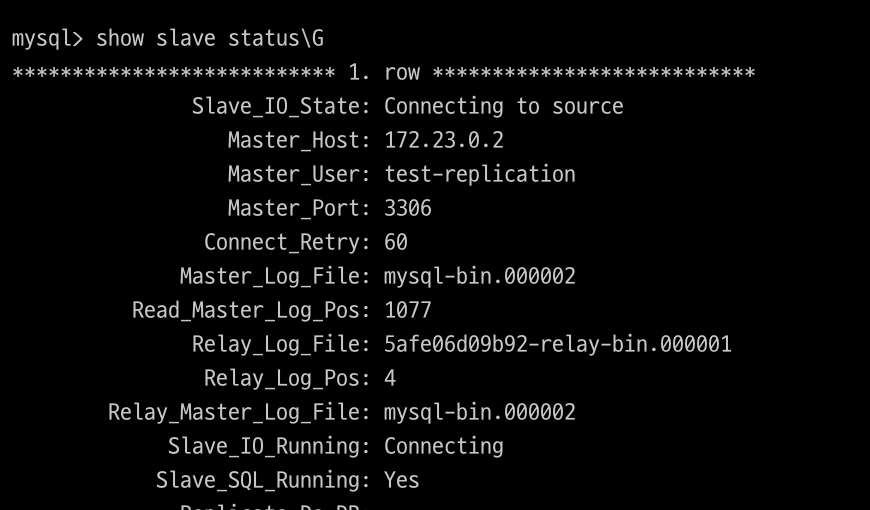 ๋ง์ฝ Slave_IO_Running๊ฐ Connecting์ผ๋ก ๋ฌ๋ค๋ฉด, ์๋๋ก ๋ด๋ ค Last_IO_Error ํญ๋ชฉ์ ๋ณด์.