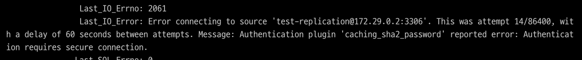 CHANGE MASTER TO MASTER_HOST='172.29.0.2', MASTER_PORT=3306, MASTER_USER='test-replication', MASTER_PASSWORD='test', MASTER_LOG_FILE='mysql-bin.000003', MASTER_LOG_POS=880, GET_MASTER_PUBLIC_KEY=1;