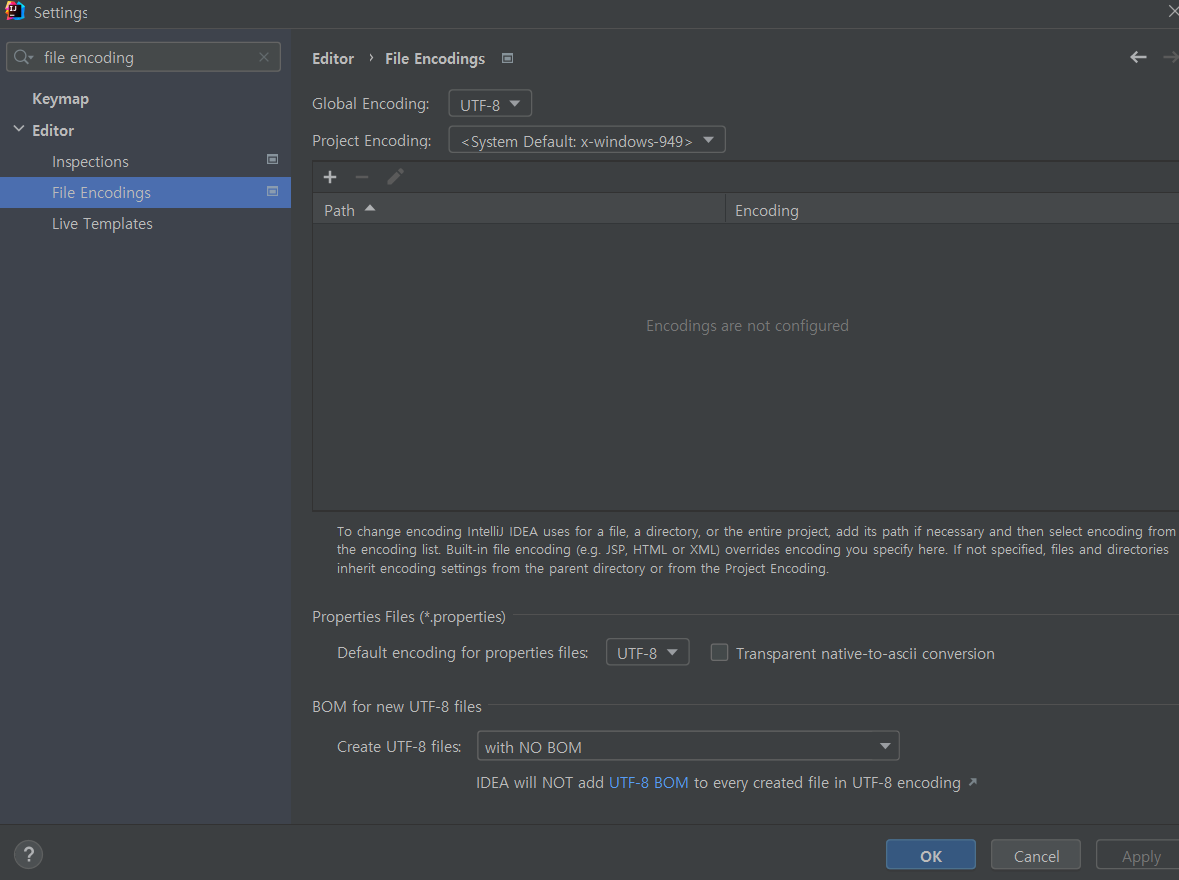- ์ฐธ๊ณ ๋ก, intellij ๊ธฐ์ค ํ๊ธ ์ฌ์ฉ ์ file encoding์์ UTF-8๋ก ๋ณ๊ฒฝํด์ค์ผ ํ๋ค.