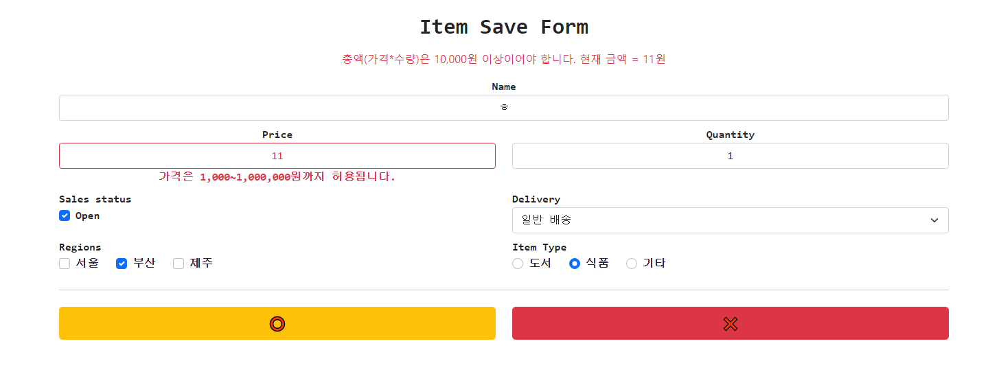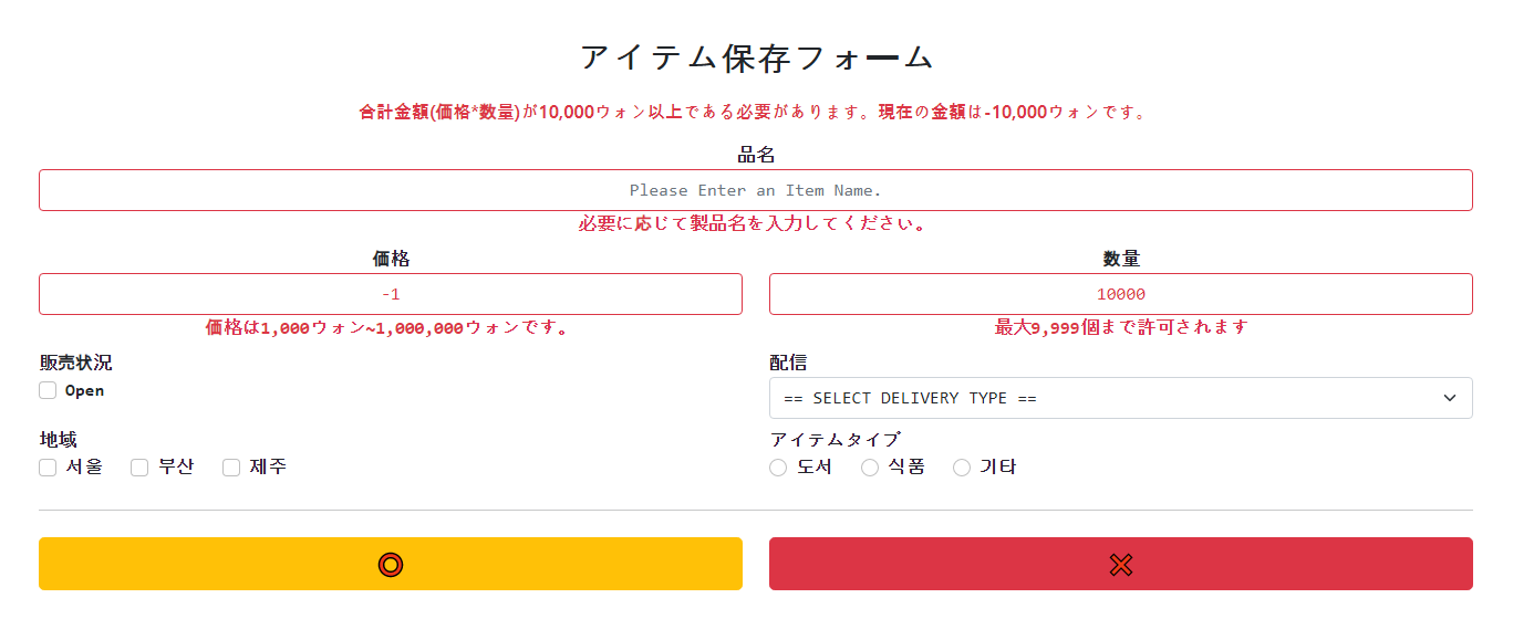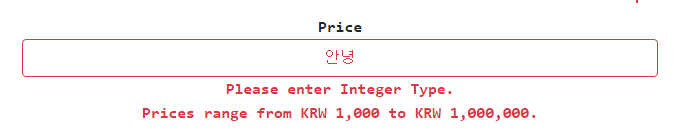 - ์ฐ๋ฆฌ์ ์ํ ๋ฑ๋ก ํผ ์ค ๊ฐ๊ฒฉ ํ๋์ ๋ฌธ์๋ฅผ ์ ๋ ฅํ๋ฉด ์คํ๋ง์ ํ์ ์ค๋ฅ์ ๊ดํ ๋ฉ์์ง๋ฅผ ์์ฑํ๋ค.