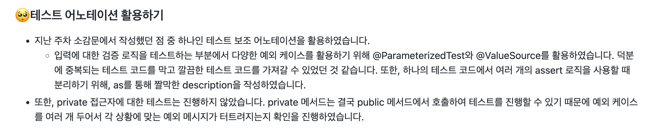 ์ฌ์ค ํ ์คํธ ์ฝ๋์ ์๋ ๋ชฉ์ ์ ๊ธฐ๋ฅ ๊ตฌํ์ด ๋๋ ๋๋ง๋ค ์์ฑํ๋ฉด์ ๋ฐ๋ก ์์ ํ๋๋ก ํด์ผ ๋๋ ๊ฑด๋ฐ,