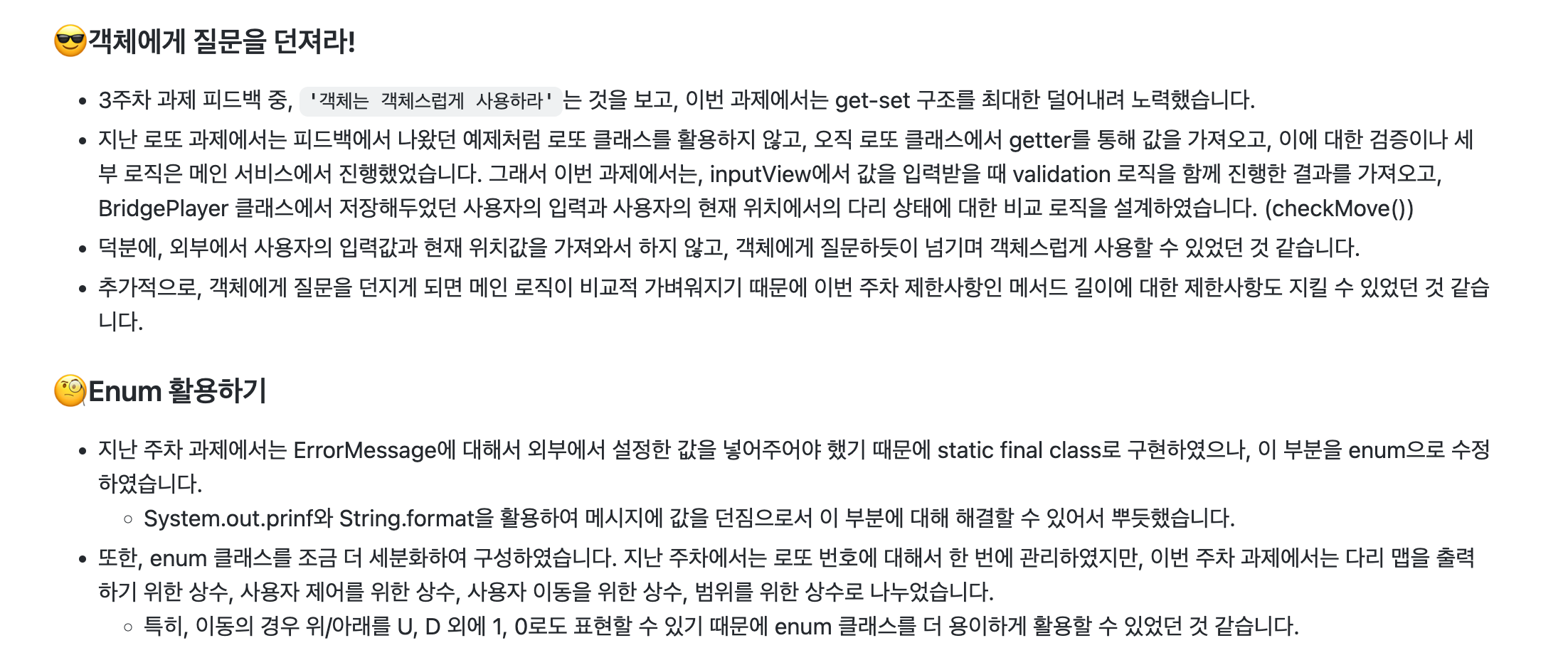 - ๊ฐ์ฅ ์ ๊ฒฝ ์ด ๋ถ๋ถ์ enum ํด๋์ค์ ํ ์คํธ ์ฝ๋์ ๋ํ ๋ถ๋ถ์ด์๋ค. ๊ทธ๋ฆฌ๊ณ ๊ฐ์ฒด๋ฅผ ๊ฐ์ฒด๋ต๊ฒ ์ฌ์ฉํ๋ ๊ฒ.