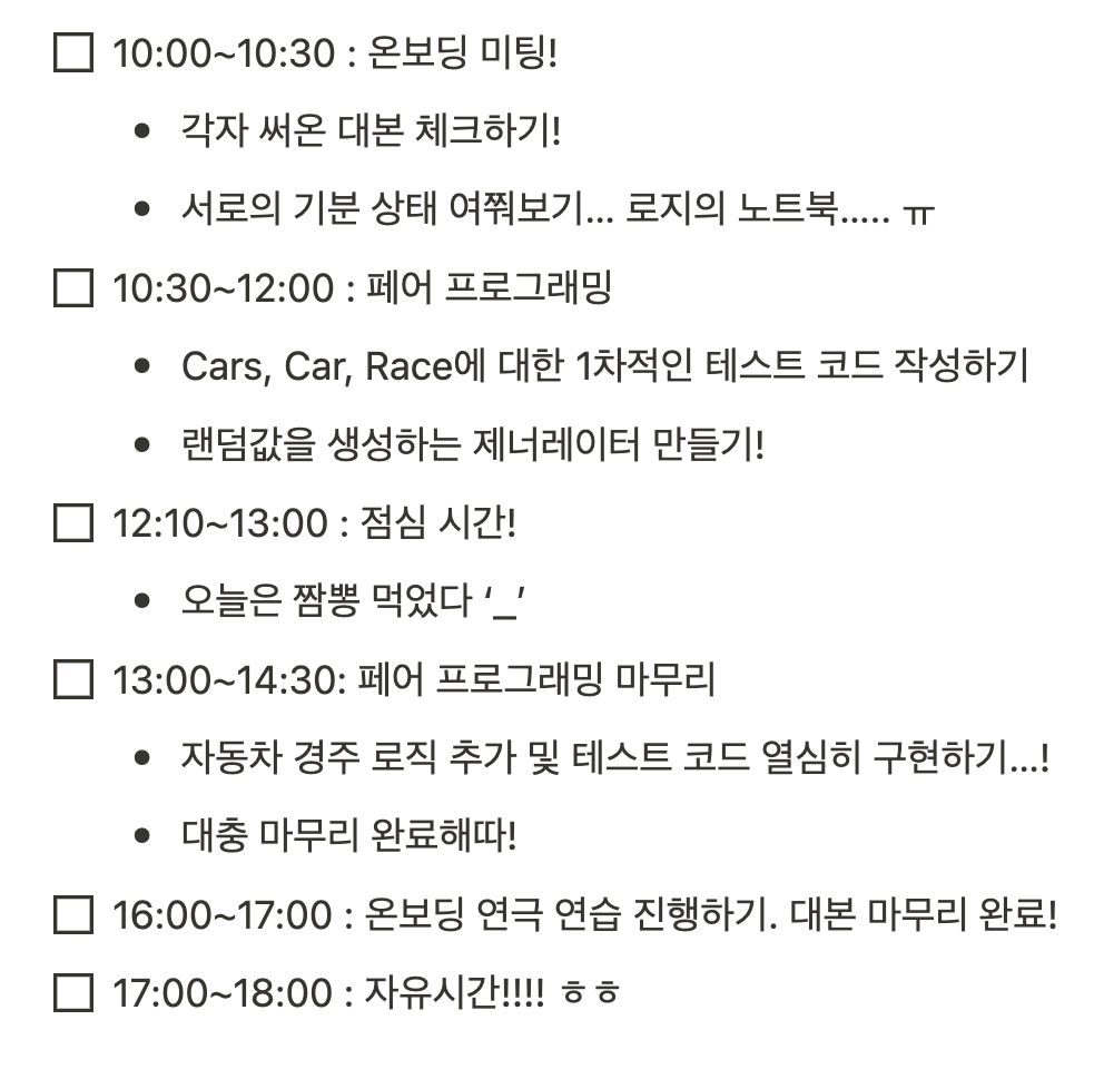 [์ฐํ ์ฝ 5๊ธฐ] 1์ฃผ์ฐจ ํ๊ณ ๋ก - ์ฐ๊ทน, ์๋์ฐจ ๊ฒฝ์ฃผ ๊ฒ์ ๊ตฌํํ๊ธฐ ๋ณธ๋ฌธ
