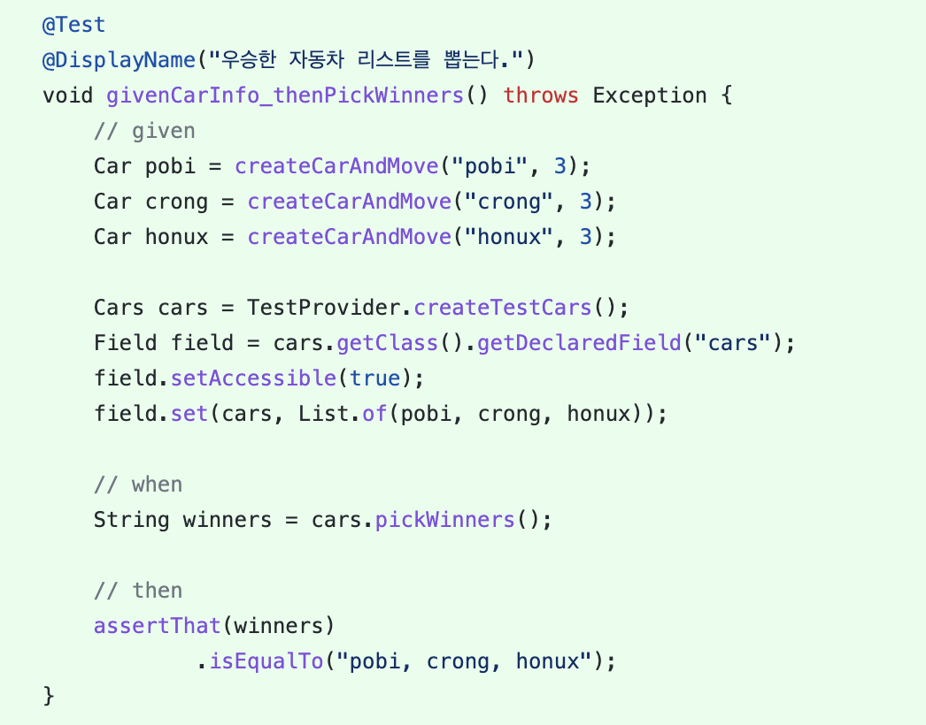 [TDD] ์๋ฐ ํ ์คํธ ์ฝ๋, ๋จ์ ํ ์คํธ, ํ ์คํธํ๊ธฐ ์ด๋ ค์ด ๋ถ๋ถ (feat. ์๋์ฐจ ๊ฒฝ์ฃผ ๊ฒ์)