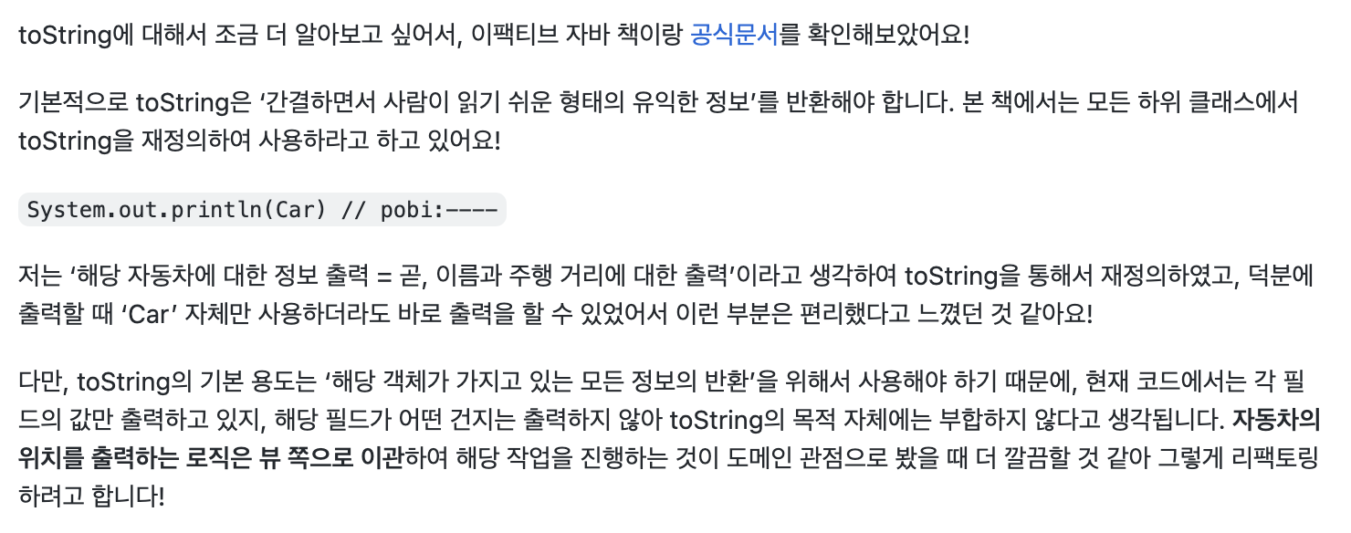 ๋ํ, toString()์ ํตํด์ ๋น์์๋ ์๋์ฐจ ์ด๋ฆ๊ณผ ์ฃผํ๊ฑฐ๋ฆฌ๋ฅผ ์ถ๋ ฅํ๋ ค๊ณ ํ์ผ๋ (์ฌ์ค ํ๋ฆฌ์ฝ์ค ๋ ๊ทธ๋ ๊ฒ ํด์๋ ๊ฒ ๋ฒ๋ฆ์ด ๋์๋ค.) ์ด ๋ถ๋ถ๋ ๋ฆฌ๋ทฐ์ด๋์ด toString()์ ๋ชฉ์ ์ฑ์ ๋ํด ์๊ฐํด ๋ณด๋ผ๊ณ ํ์ ์ ๋ค์๊ณผ ๊ฐ์ด ์ ์๋ด๋ ธ๋ค.